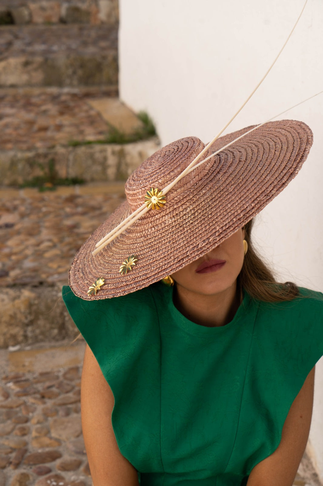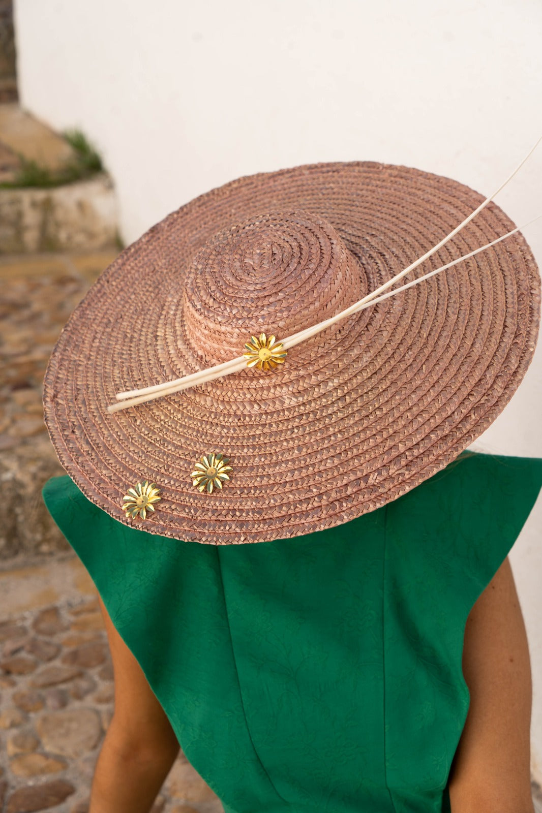 Pamela de paja con raquis de plumas y detalles metálicos, en color rosa con efecto dorado teñido de forma artesanal.