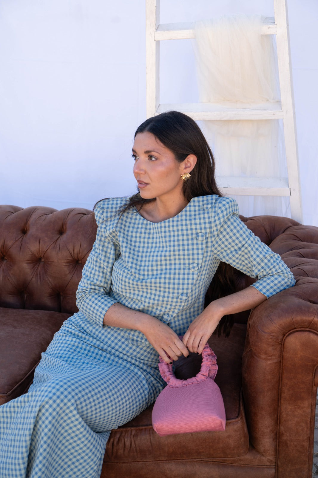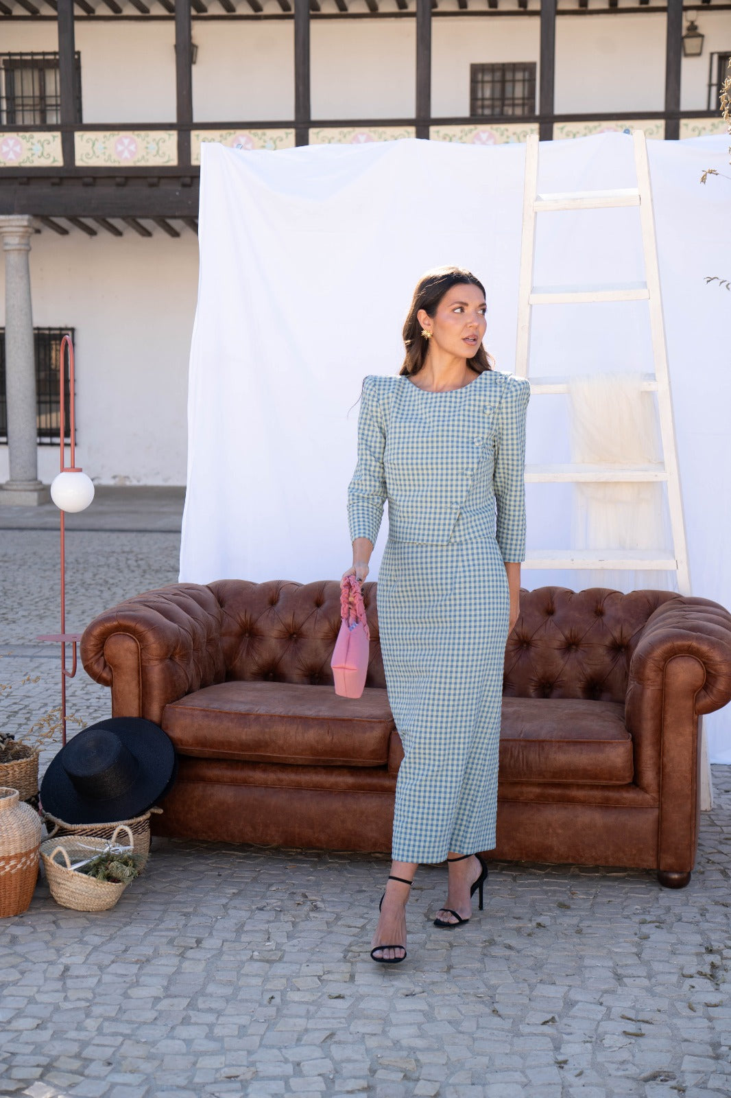 Conjunto compuesto por blusa, escote redondo, cruzada y abotonada, falda alta con abertura trasera. En vichy azul y verde.