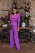 Conjunto compuesto por top, escote a pico, manga larga volante delantero y trasero y pantalon tiro alto recto. En color rosa.