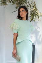 Vestido midi, escote redondo, manga corta, hombro caído con detalle plumas, corte en cintura con peplum. En color verde.