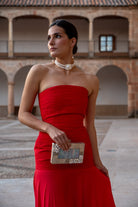 Vestido largo, palabra de honor con cuerpo totalmente drapeado a mano en tafeta de seda. Corte bajo la cadera con falda de capa en un ligero crepé. En color rojo.