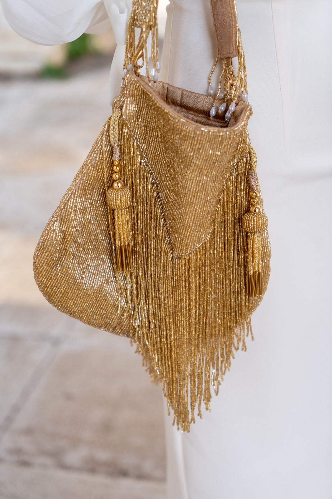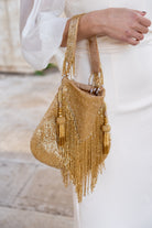 Bombonera dorada, compuesta por abalorios, asa corta, igual por delante y detras.