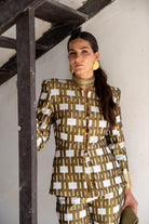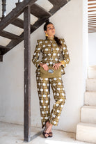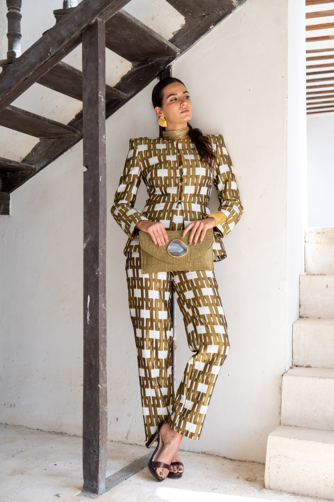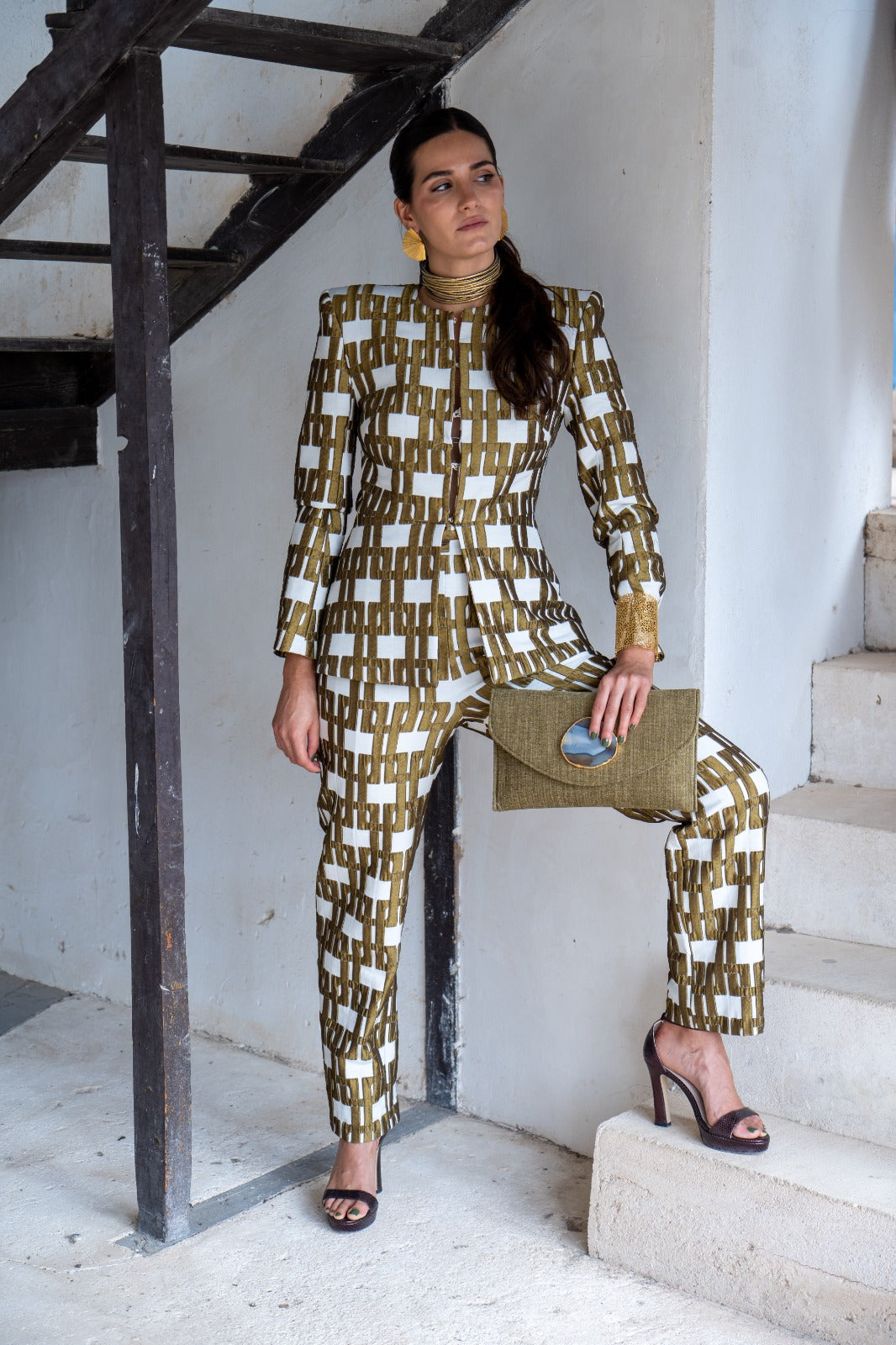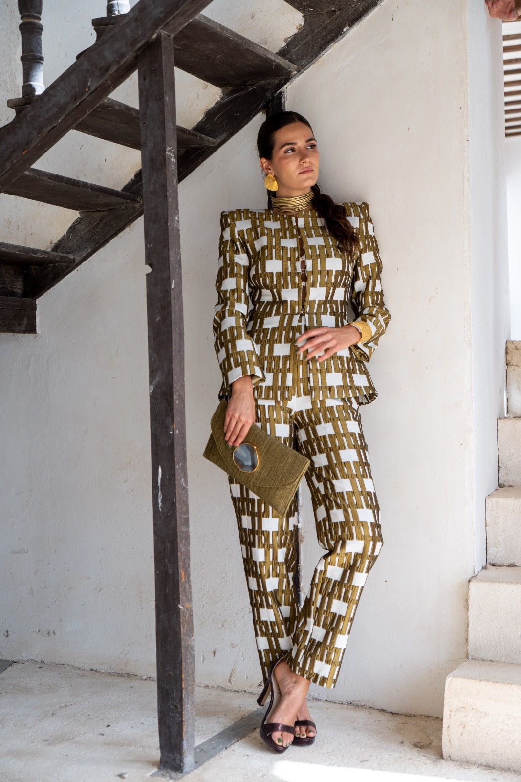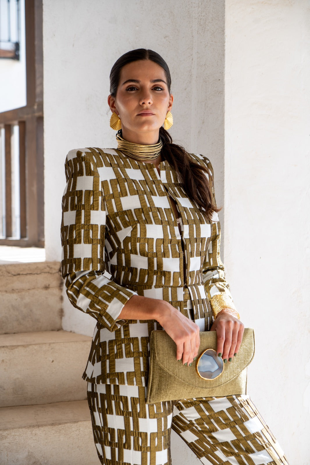 Conjunto compuesto por chaqueta Jacquard con hombros marcados, escote a la caja y abierta en el centro delantero y pantalón de tiro alto con cinturilla y corte recto. En color blanco y aceite.