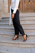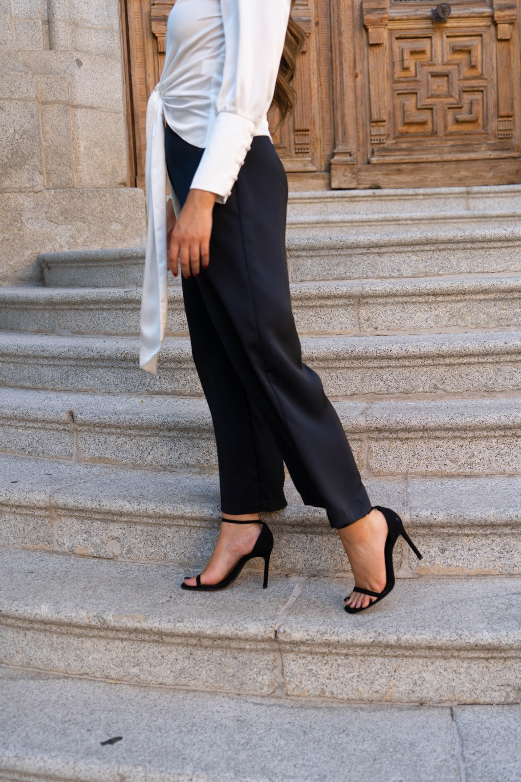 Pantalon tiro alto, cintura, cremallera trasera. En color negro.