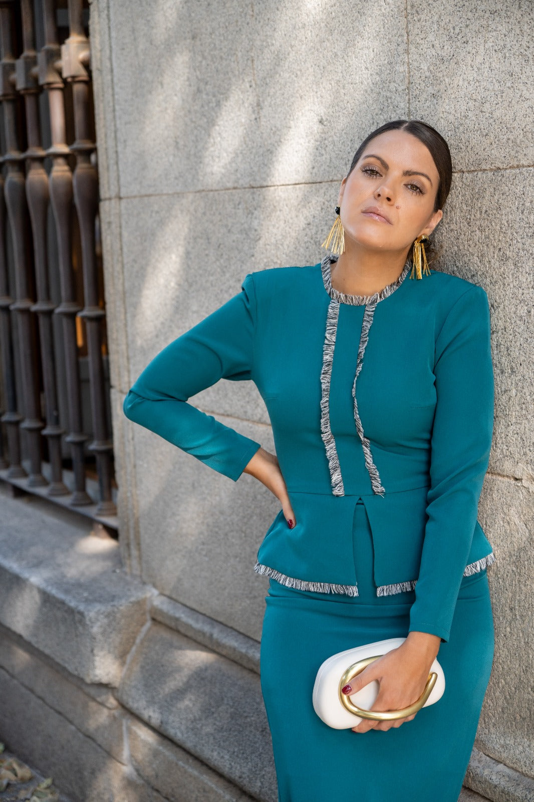 Vestido midi, escote redondo, manga larga, detalle fecos delanteros, plepum en cintura. En color verde.
