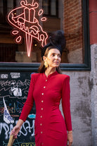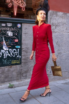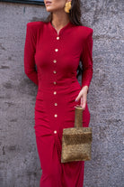 Vestido midi en punto seda, cuello subido, manga larga, detalle botones y frunce delantero, totalmente elastico. En color rojo.
