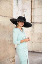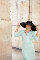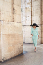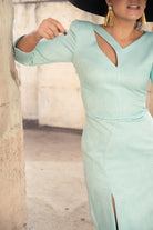 Vestido midi, escote a pico y pequeña abertura a un lado, manga francesa, abertura delantera a un lado. En color verde con dibujo y detalla en lurex plata.