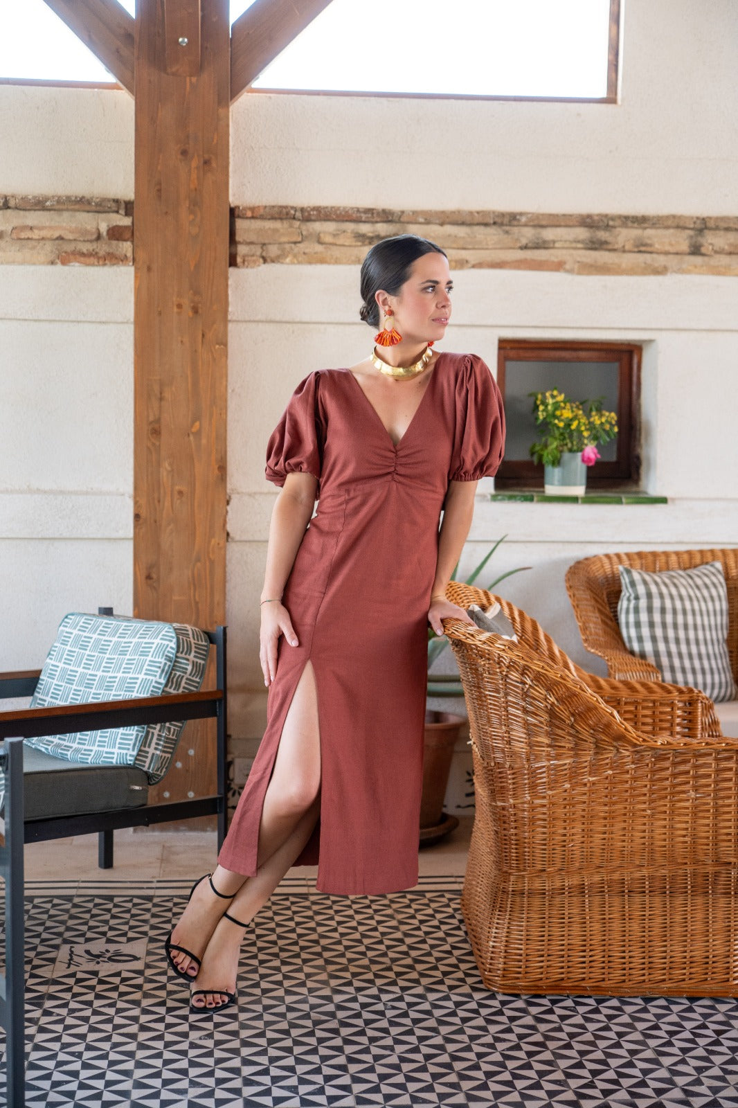 Vestido largo, escote a pico, manga corta abullonadas, anudado en la espalda abertura delantera a un lado. En color marron.