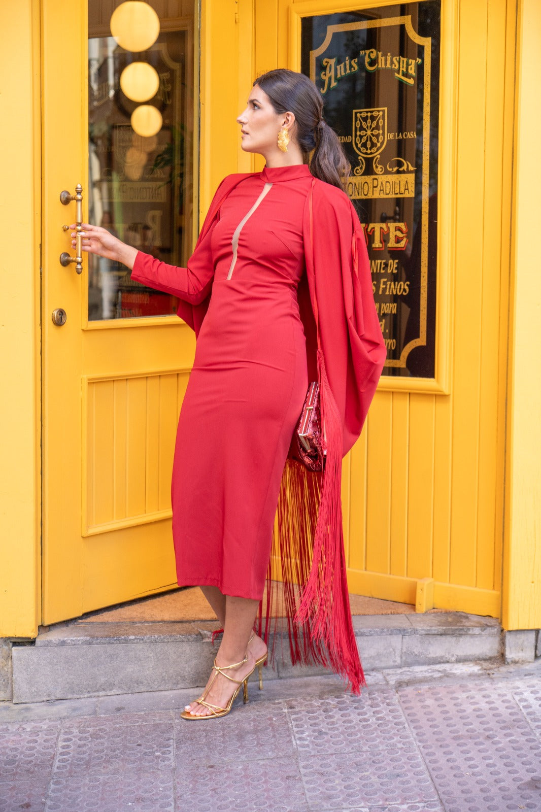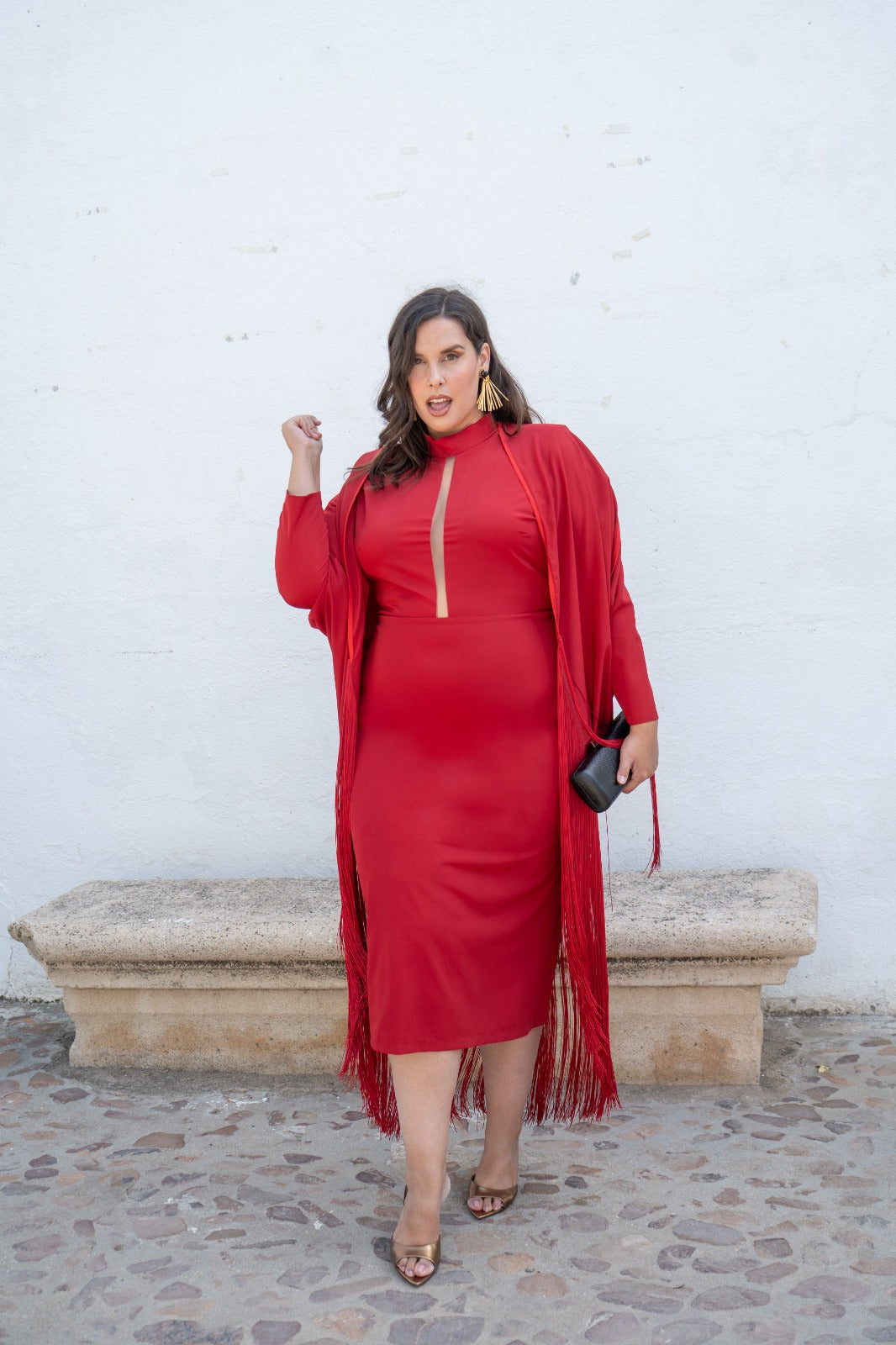 Vestido midi, escote redondo subido con tira transparente, manga francesa, abertura trasera, kaftan con flecos y fajín. En color rojo.