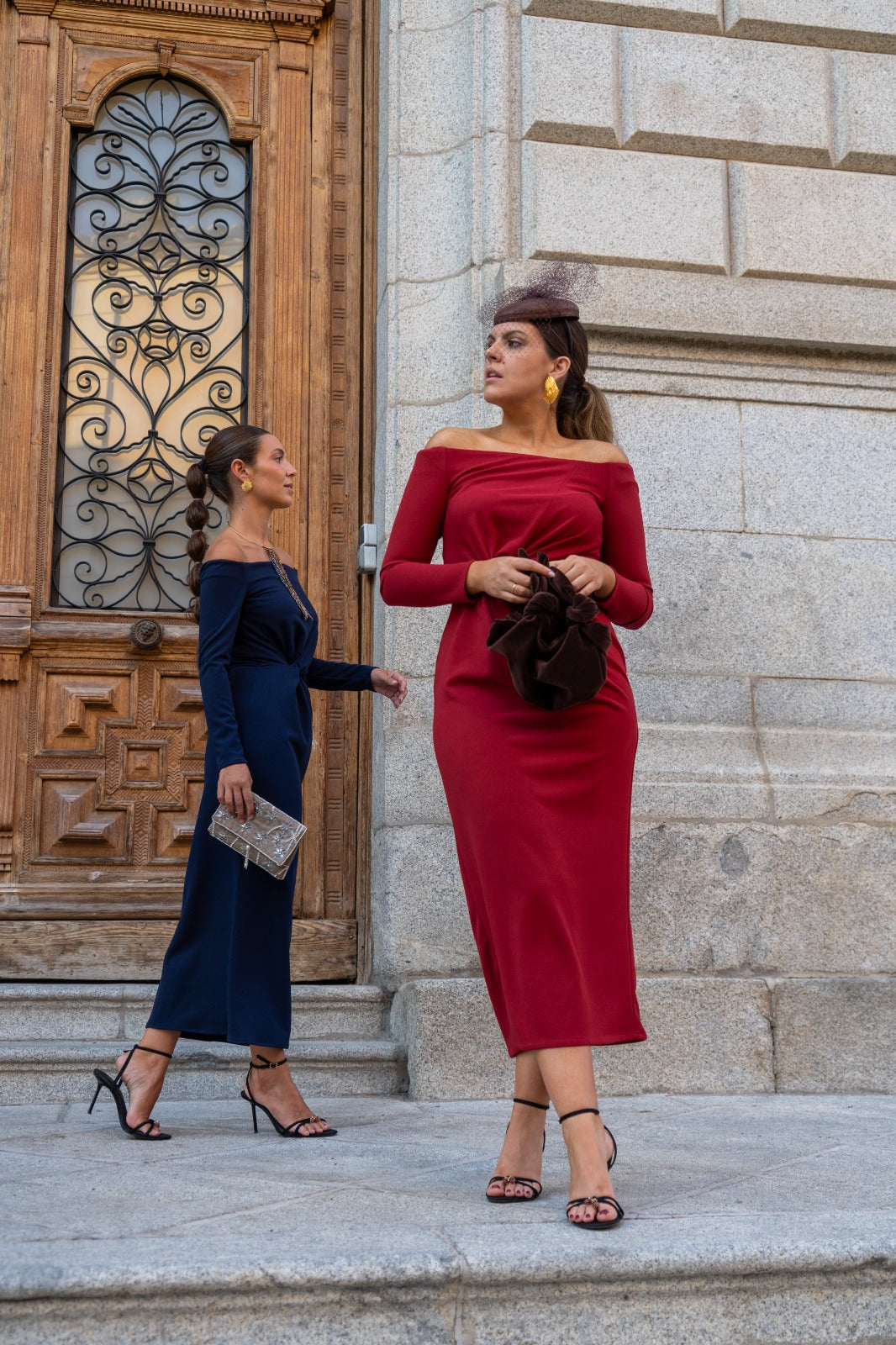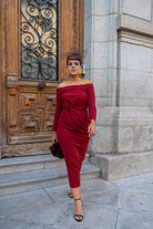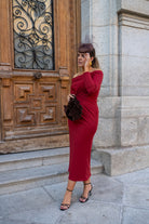 Vestido midi, escote barco, manga francesa, con nudo en cintura a un lado. En color rojo.