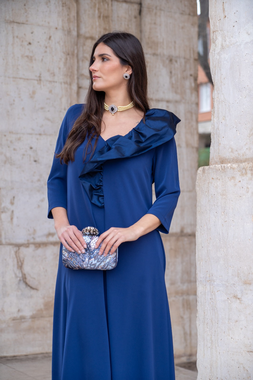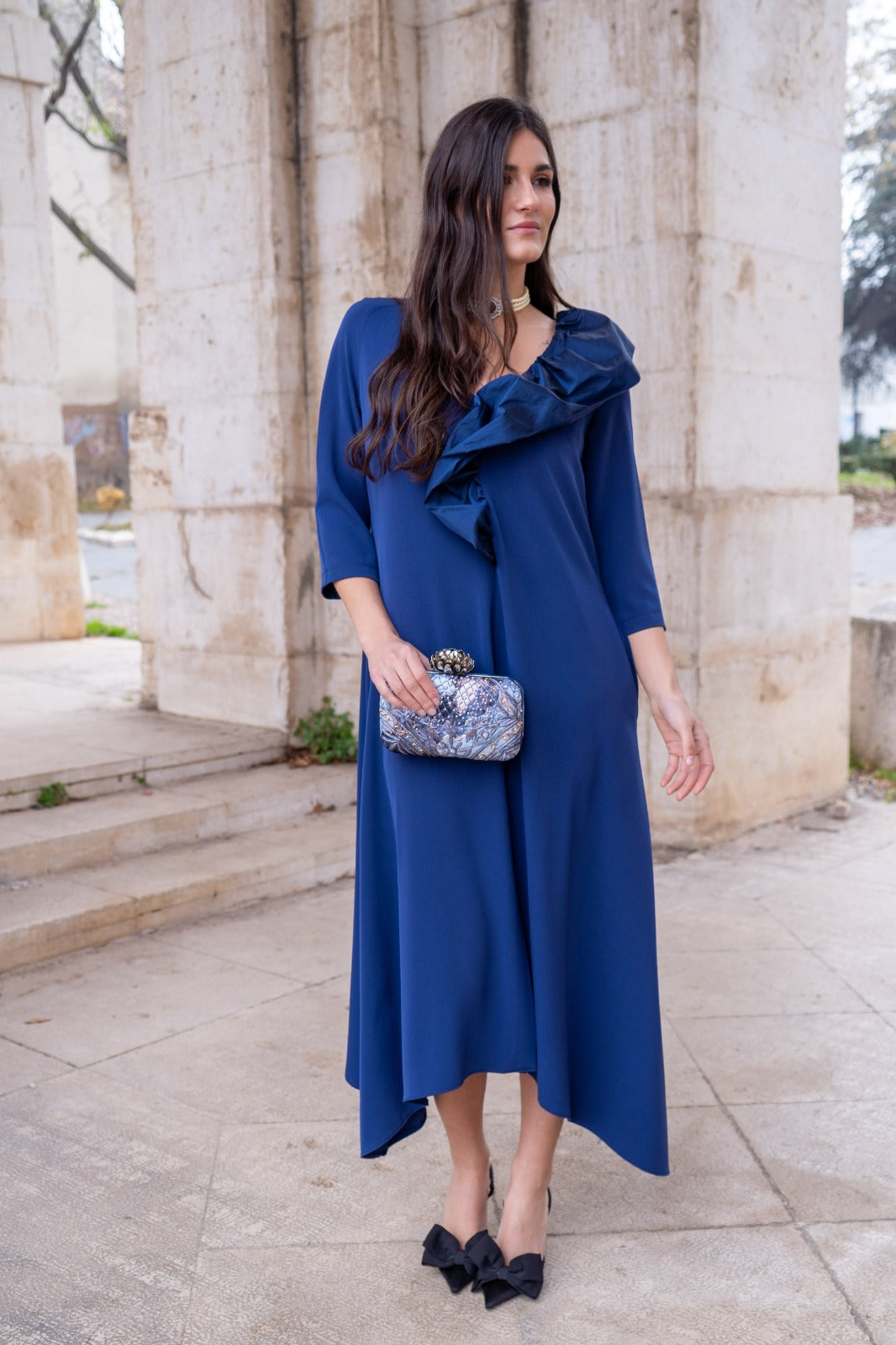 Vestido midi, escote a pico con volante en un lado, manga francesa, bolsillos laterales, mas lago de los lados, amplio. En color azul.