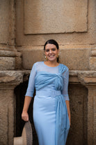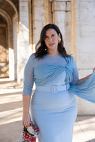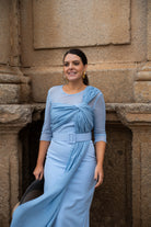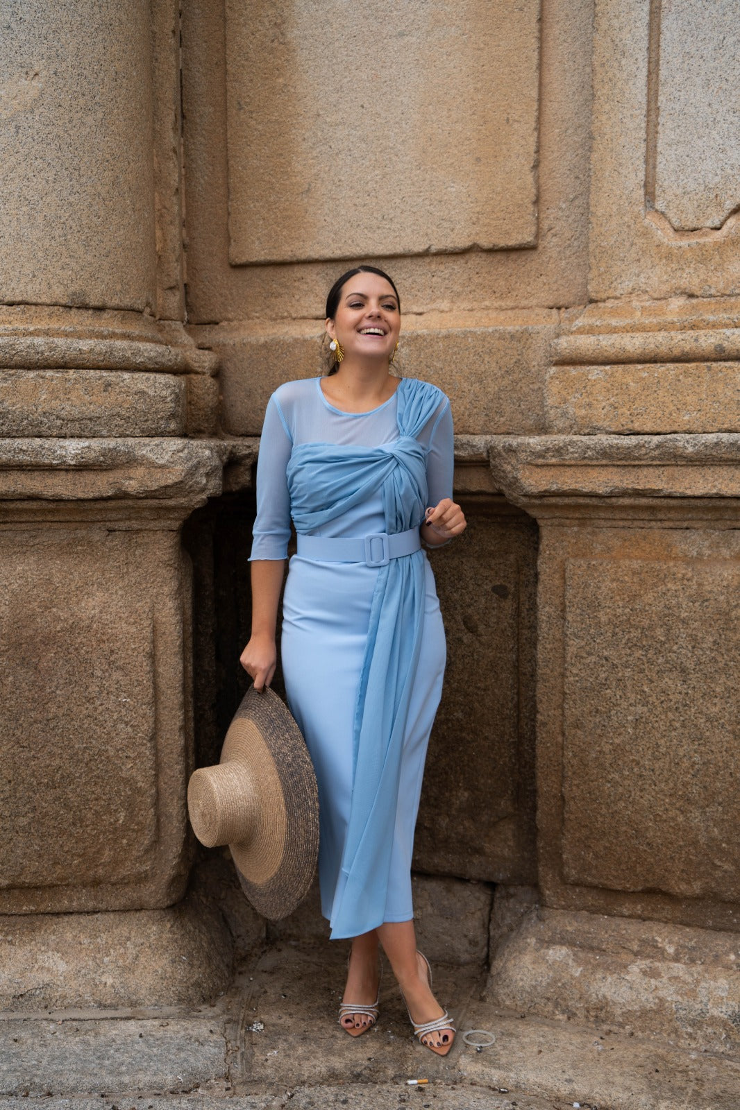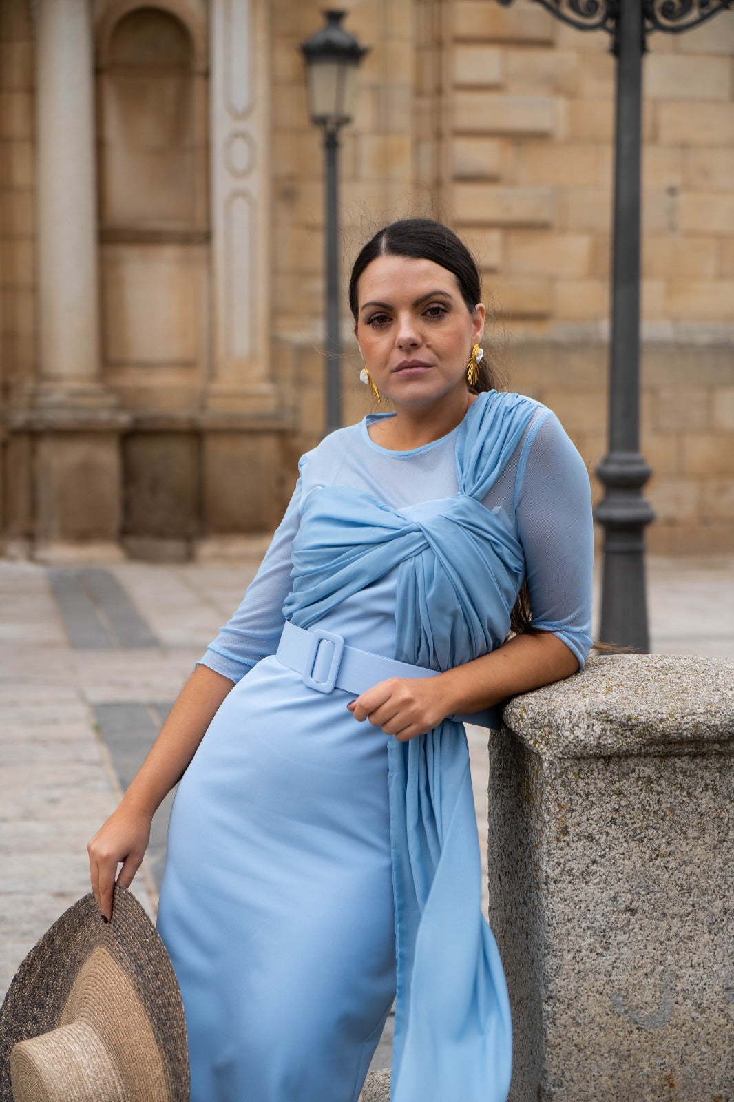 Vestido midi, escote redondo, manga francesa, parte de arriba en gasa con lazo largo en un lado, cinturon incluido, abertura trasera. En color azul.
