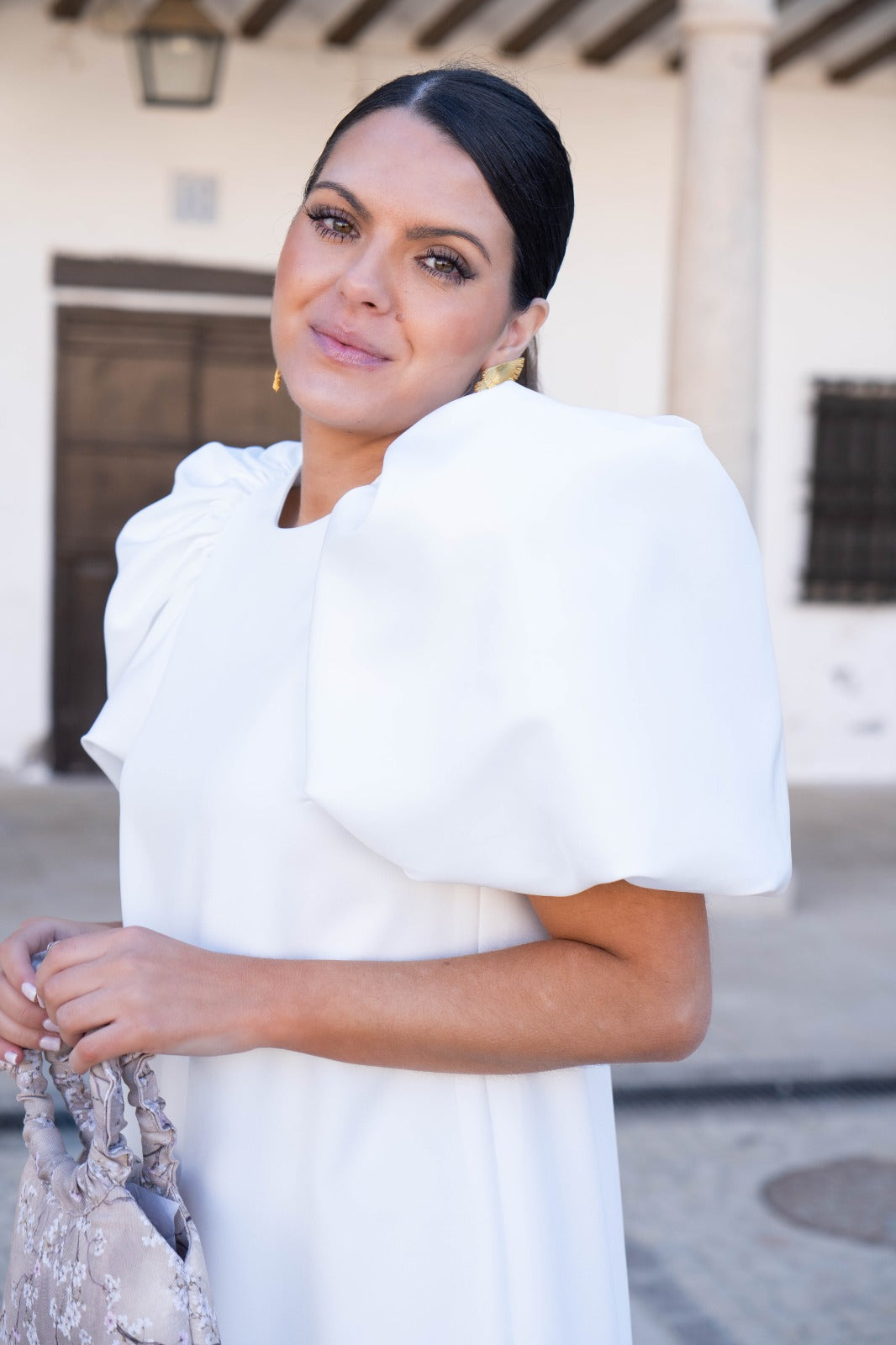 Vestido midi, escote redondo, maxi manga corta, espalda con detalle botones dorados. En color blanco.