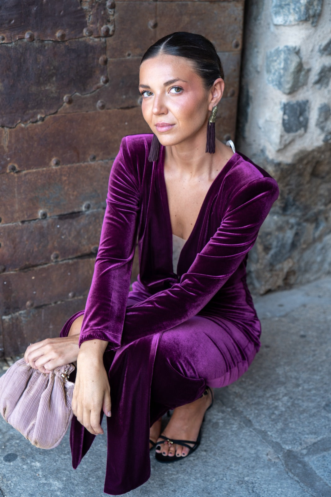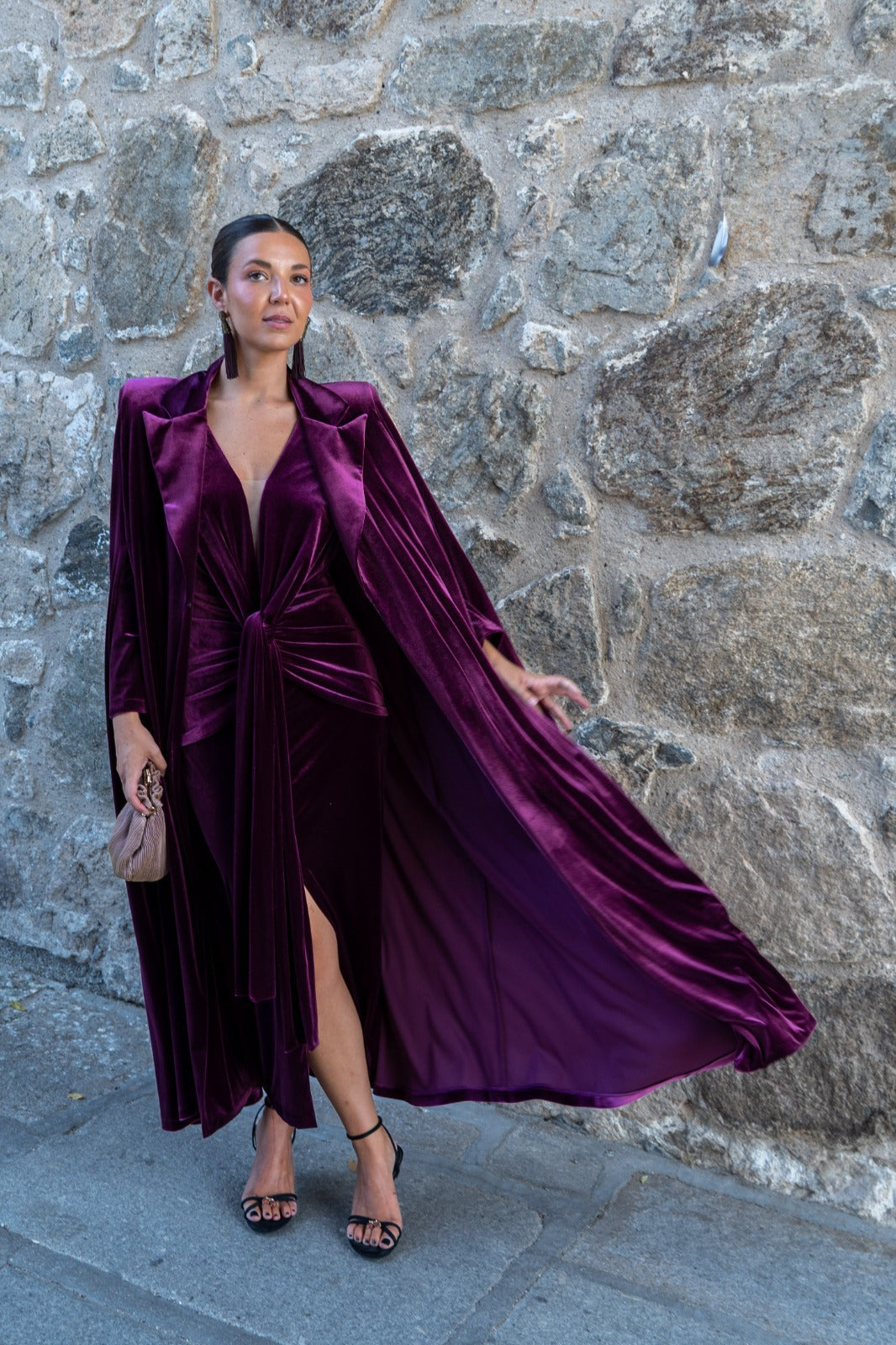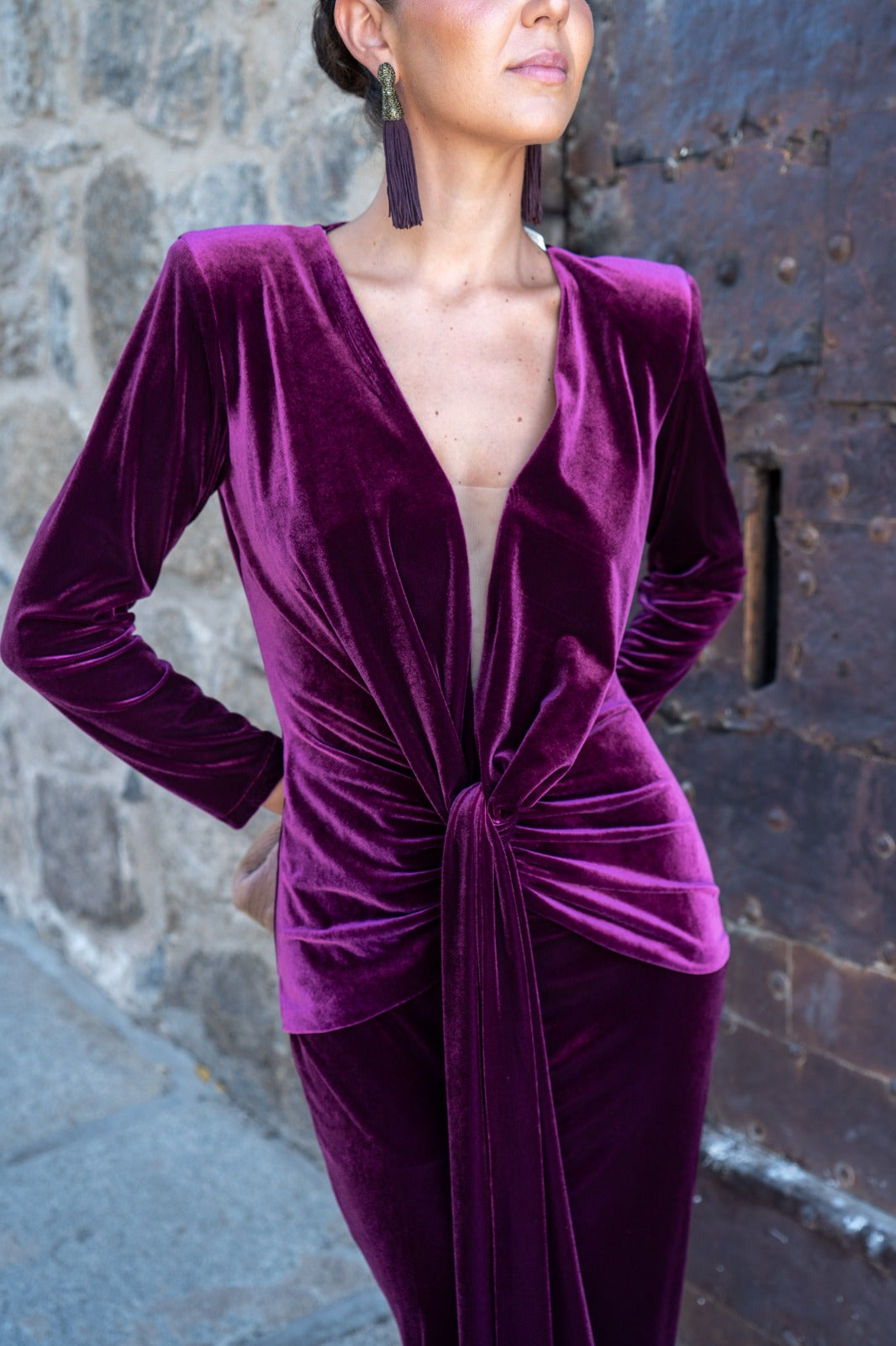 Vestido midi, escote a pico con tela transparente, manga larga, nudo en cintura, abertura delantera. En terciopelo burdeos. Ideal para combinar con nuestra capa ZAMIA.