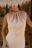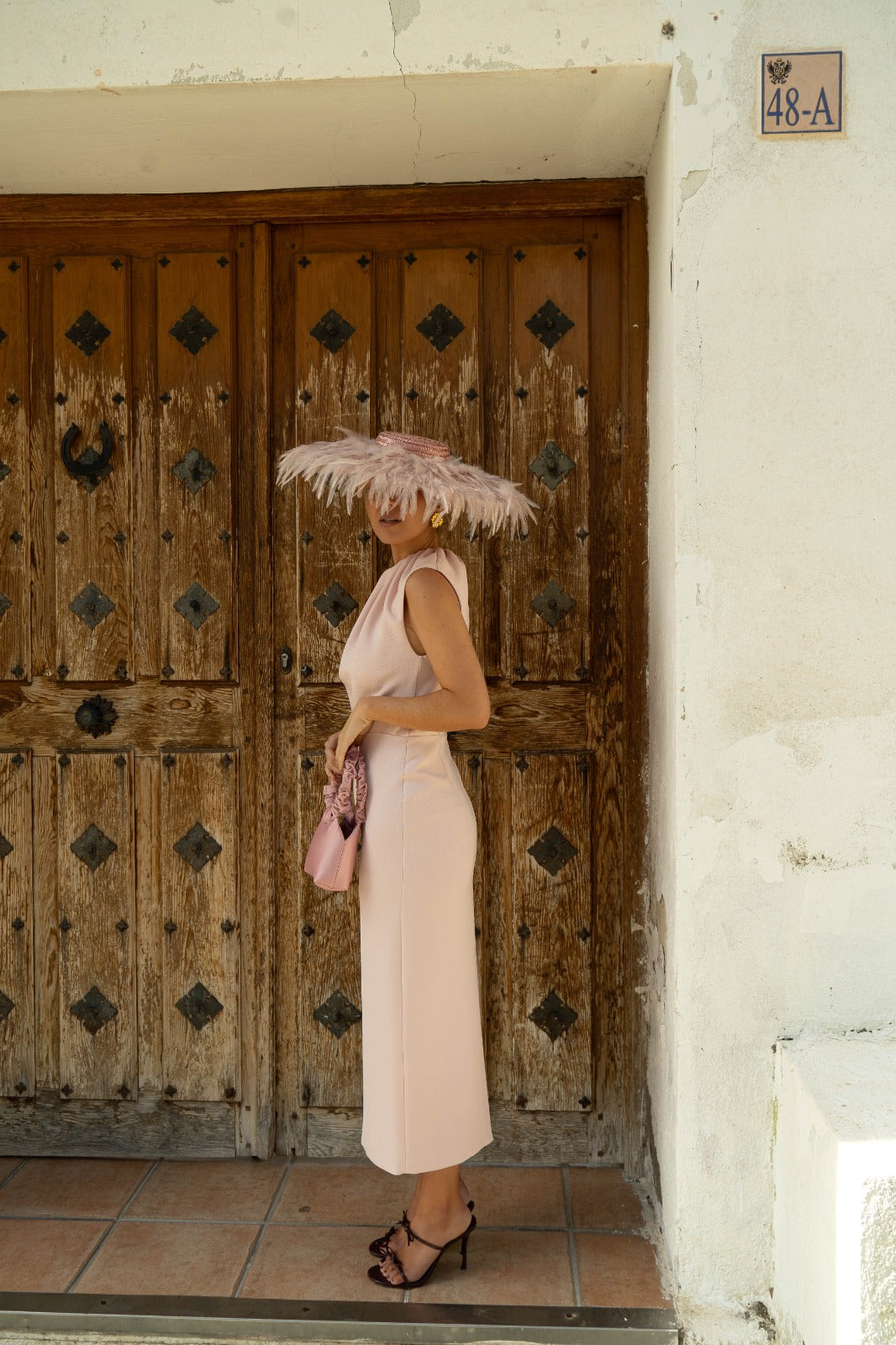 Vestido midi, cuello fruncido, sin mangas, abertura trasera. En pique color rosa.