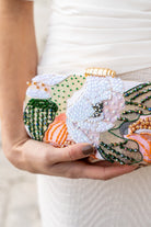 Oval handbag with a gold knob and a long chain strap. Features prints and rhinestones in various colors.