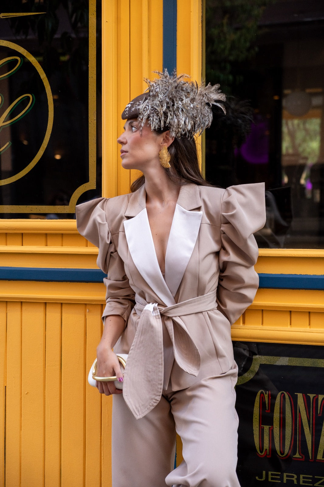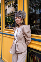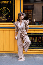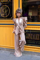 Set consisting of a jacket with a lapel, a belted double-breasted jacket, puffed sleeves, and high-waisted, wide-leg trousers. In beige.