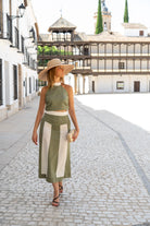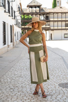 Set featuring a round-neck top with a back tie and a high, flared skirt. Two-tone green and beige.