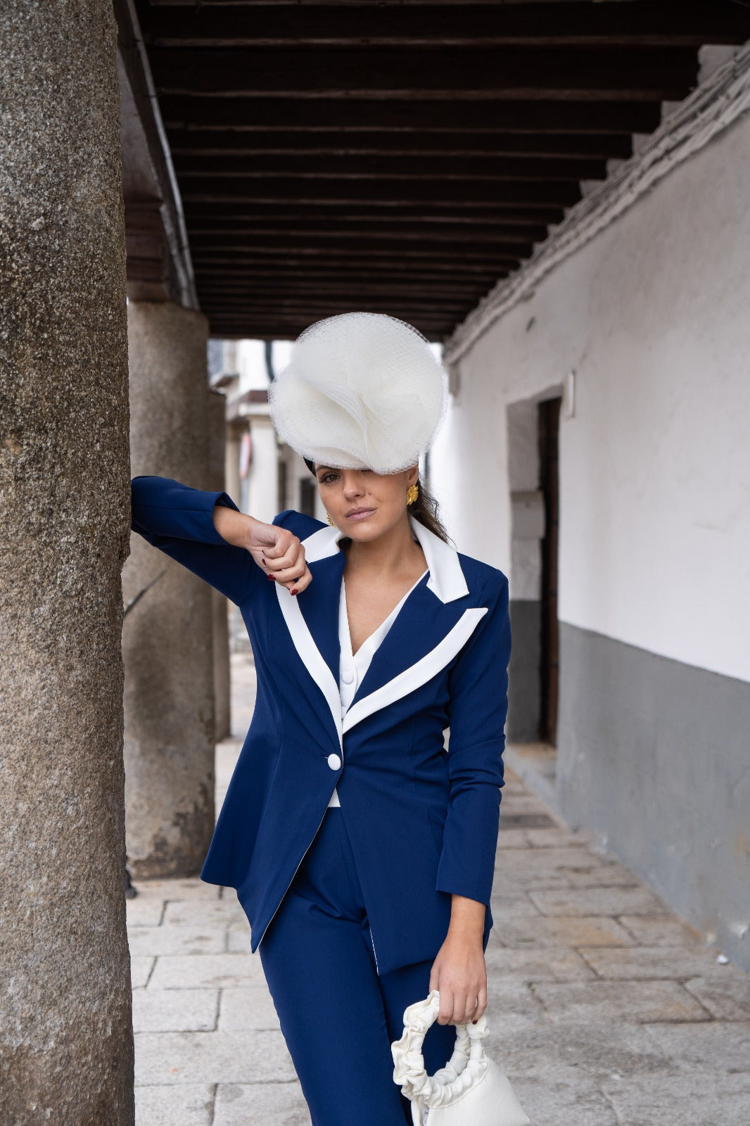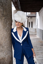 Set consisting of a long-sleeved jacket with a vest in one piece and high-waisted, straight-leg trousers. Two-tone blue and white.