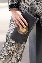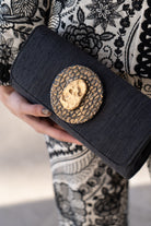 Long handbag in textured fabric, with a stone detail in the center, magnetic closure, and a gold chain strap. In black.