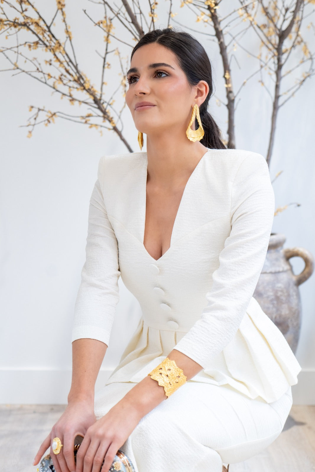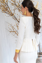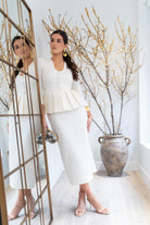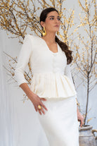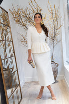 Set consisting of a sweetheart neckline blouse with three-quarter sleeves, central button detail, peplum with pleats at the waist, and a high-waisted skirt with a back slit. In beige.