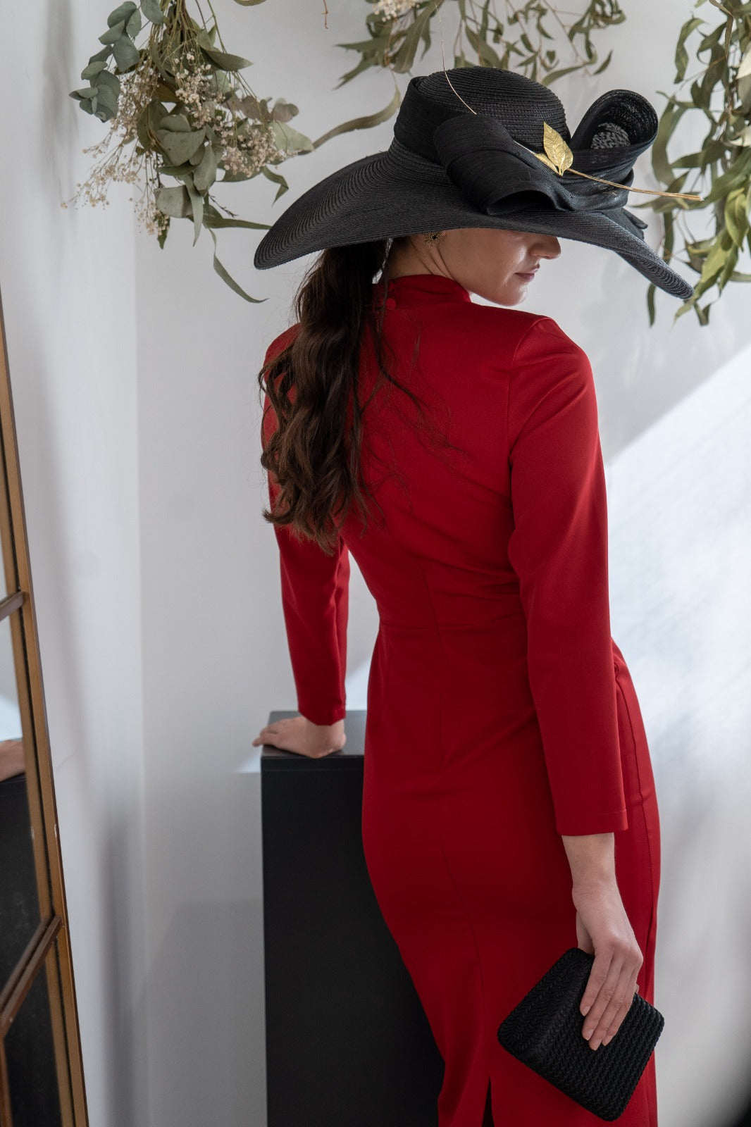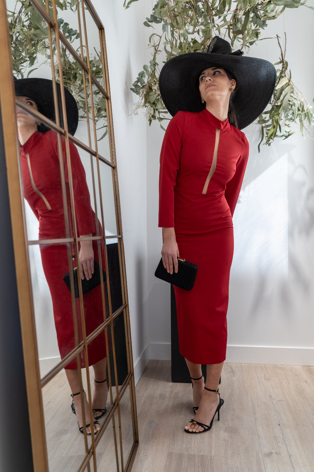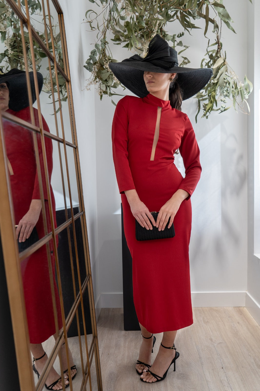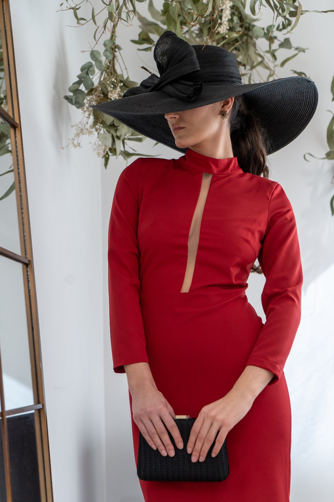 Midi dress, high round neckline with sheer strap, three-quarter sleeves, back slit. In red.
