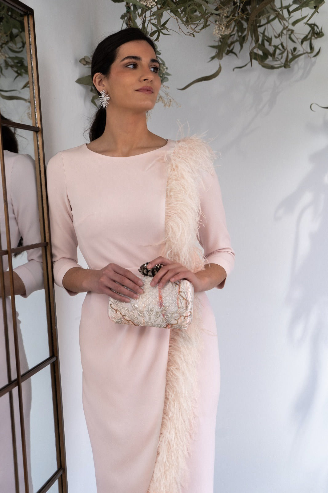 Midi dress, round neckline, three-quarter sleeves, fitted waist with sash, feather detail from shoulder to hem. In pink.