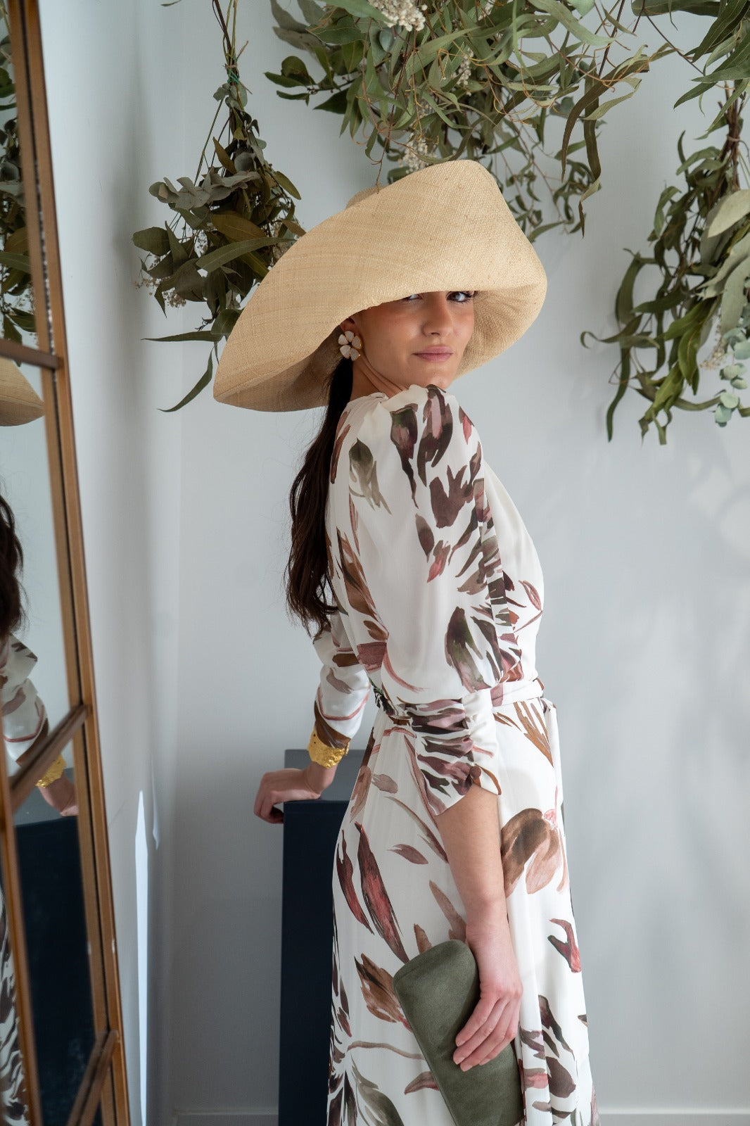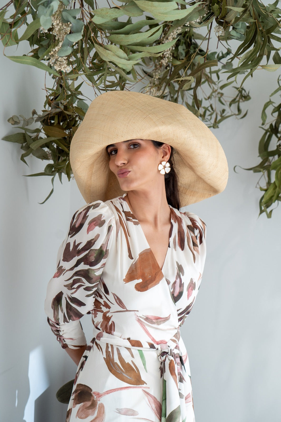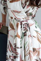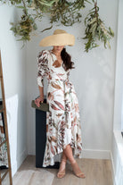 Wrap dress, short gathered sleeves, ruffle and shaping at the hem. In white with a print.