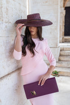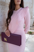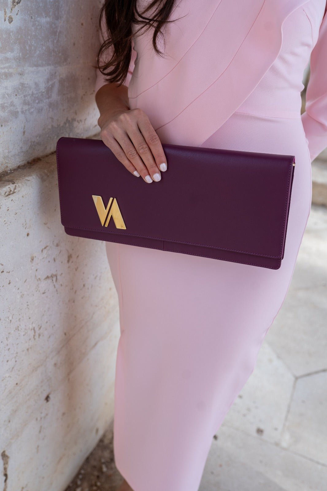 Maxi handbag in embossed textured leather, can be worn as a clutch or with a chain, and has a snap closure. Aubergine in color.