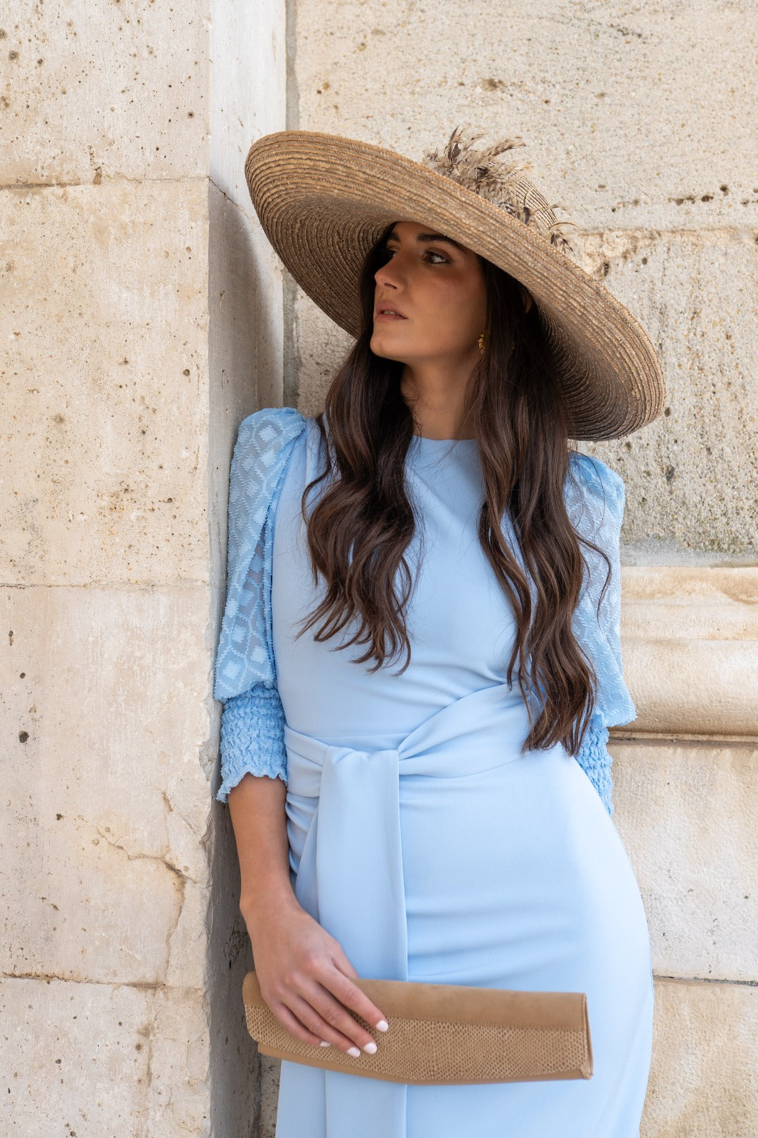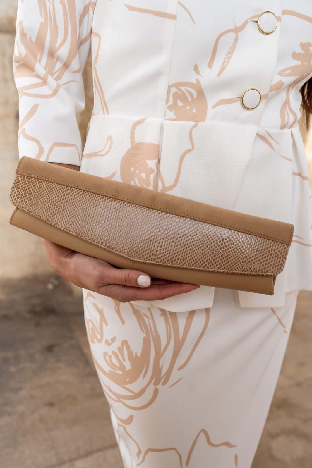 Leather baguette bag that can be used as a wallet or with a clasp, with a snap closure. Camel-colored.