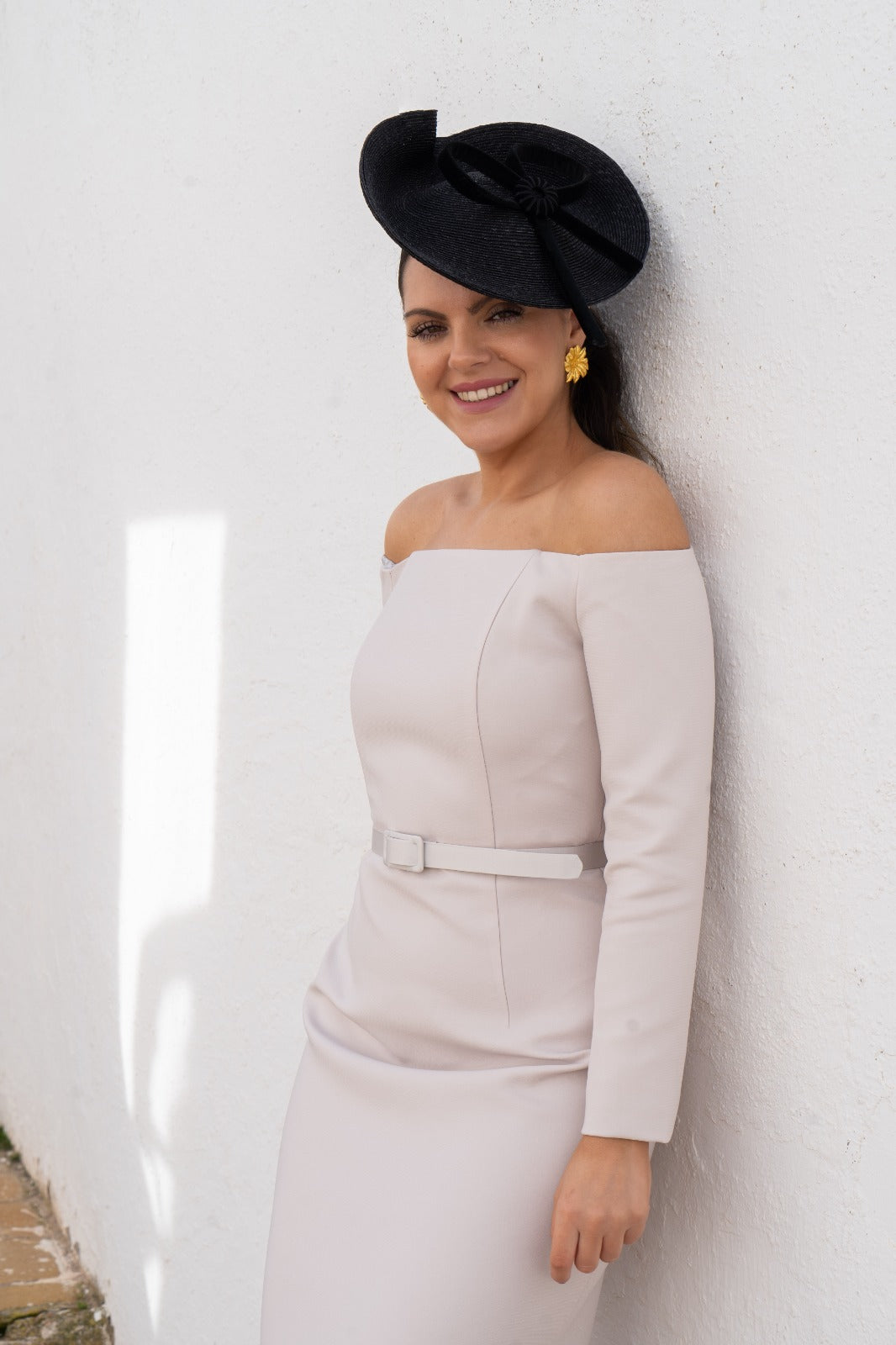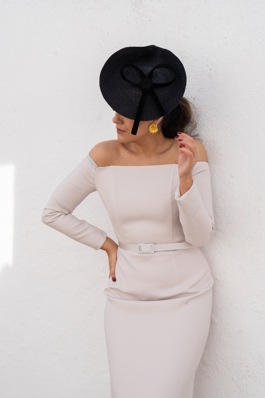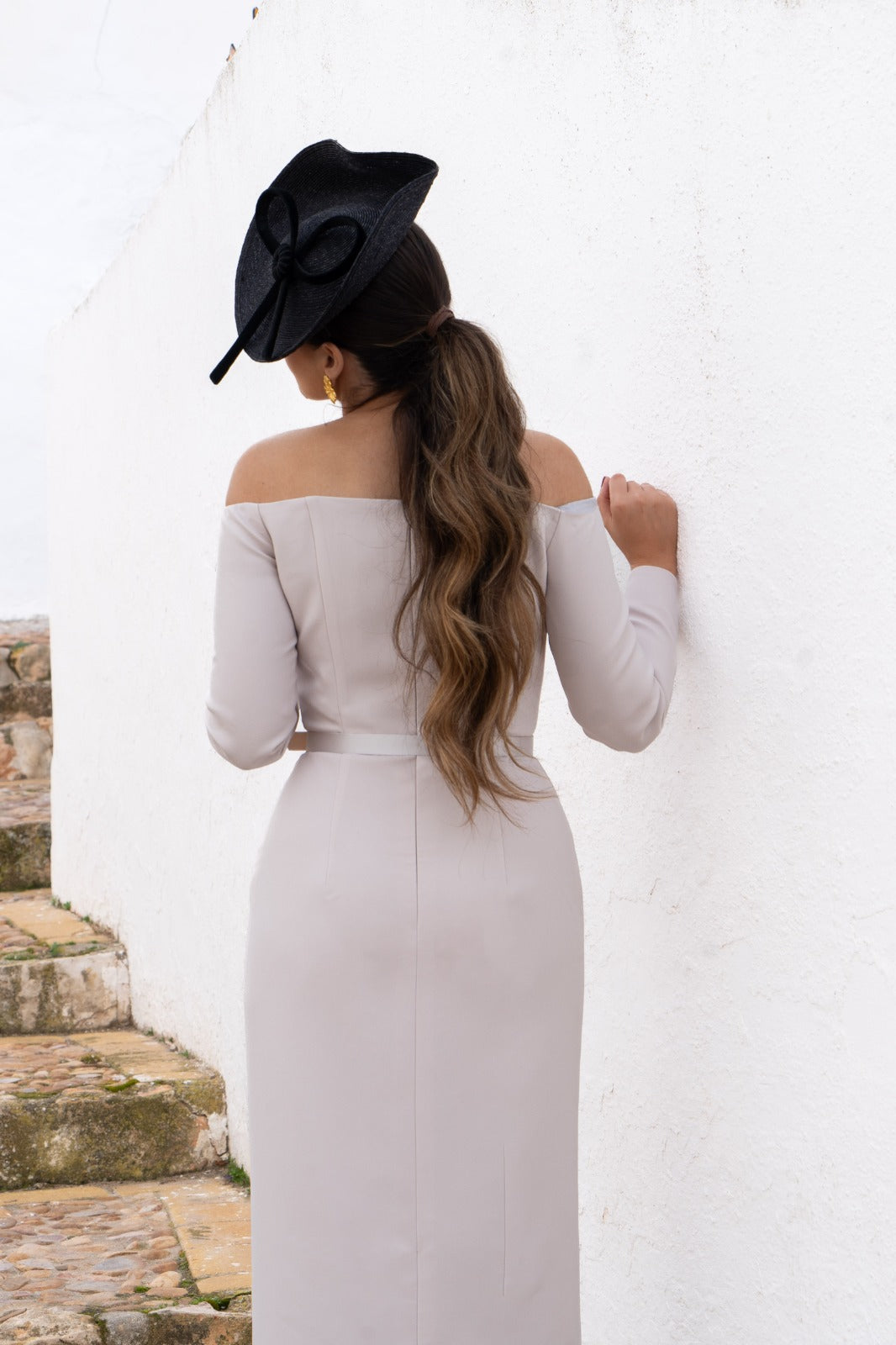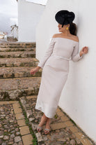 Long-sleeved dress with a bateau neckline, fully exposing the shoulders. Italian seam at the bodice and waistline, with a skirt that ends with a sheen panel in the same fabric. In pearl gray.
