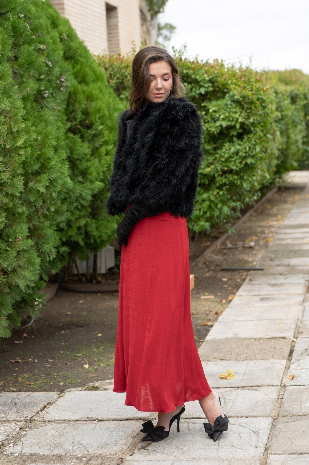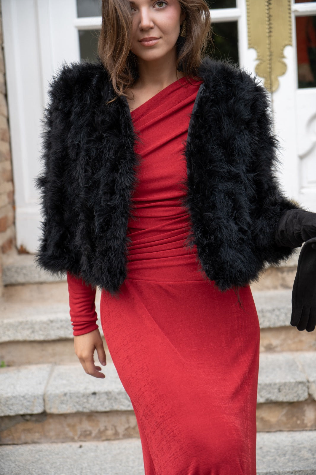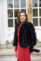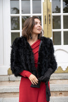 Short jacket, round neck, side pockets, in black marabou.
