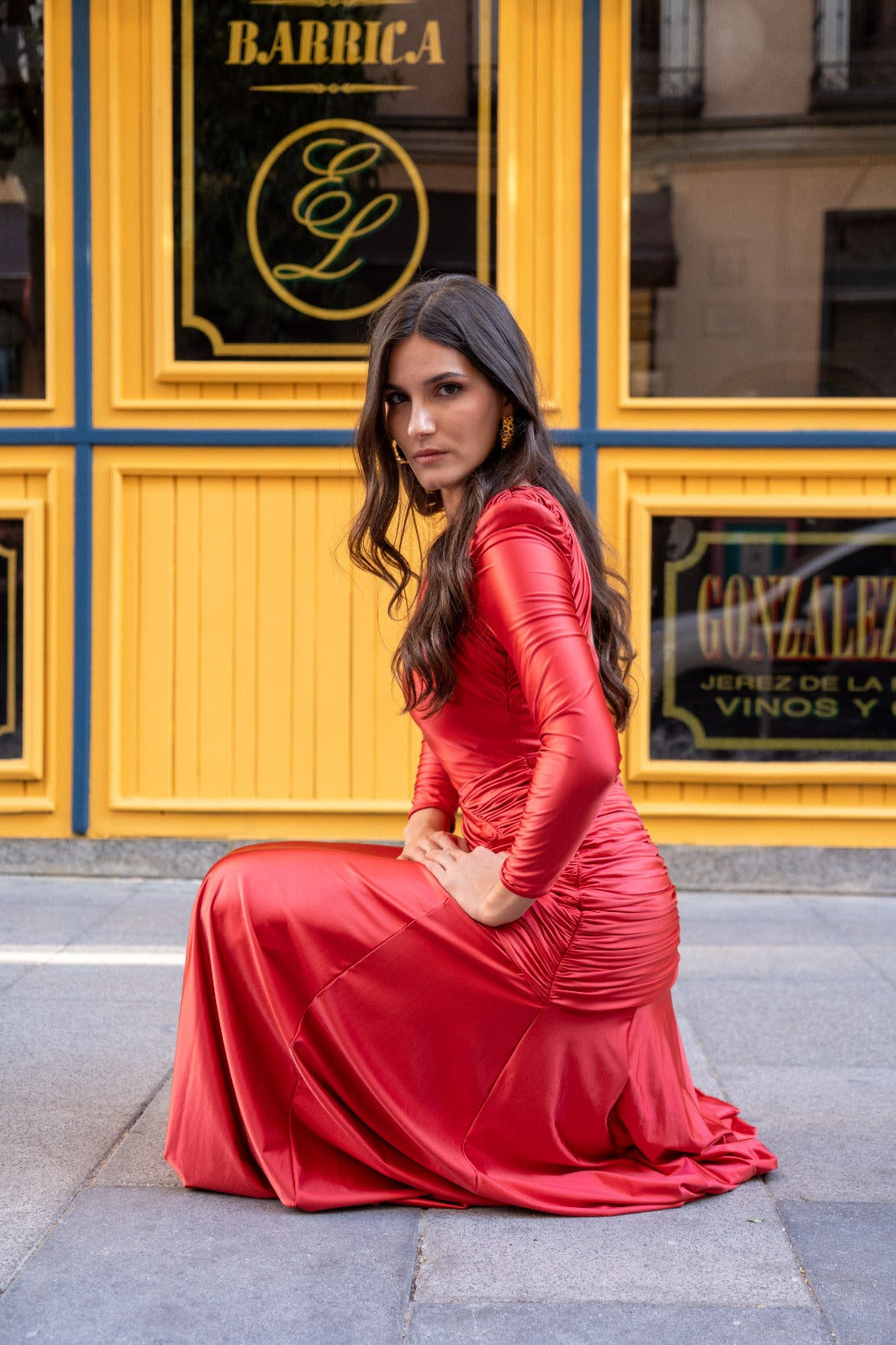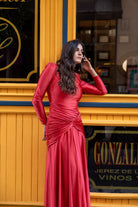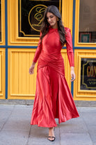 Midi dress with a round neckline, scooped back, long sleeves, multi-way drapes that wrap around the body, and a layered hem. In red with a metallic effect.