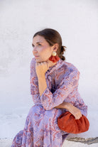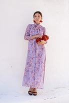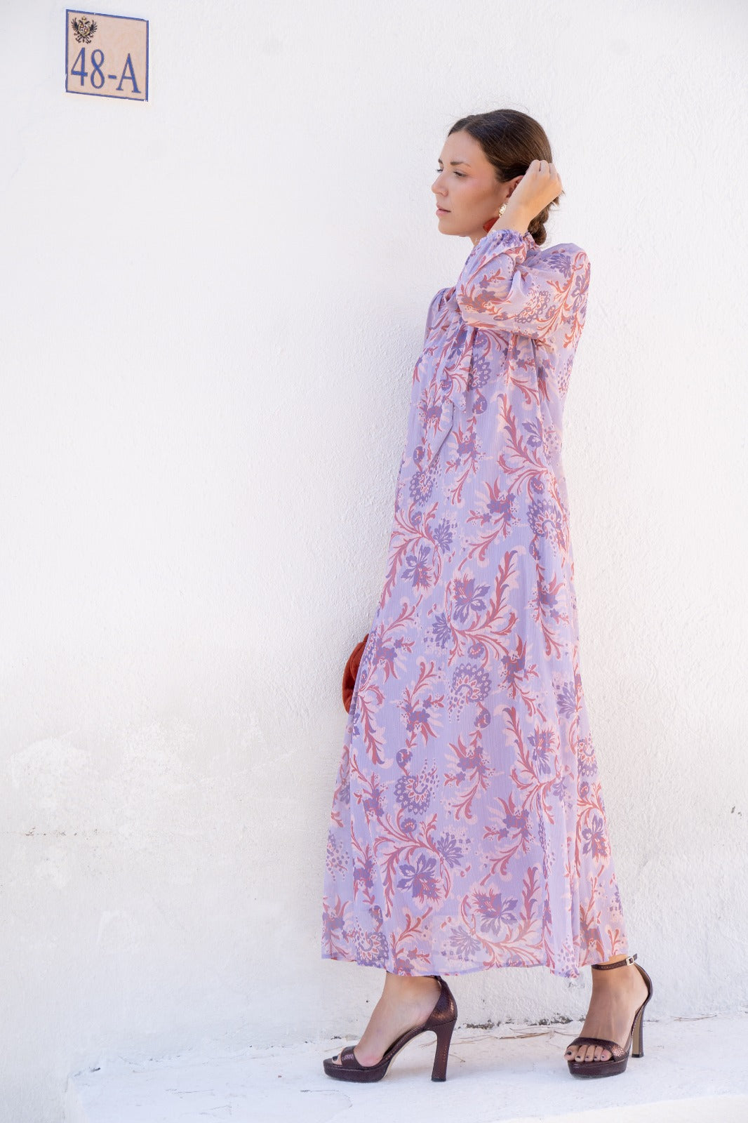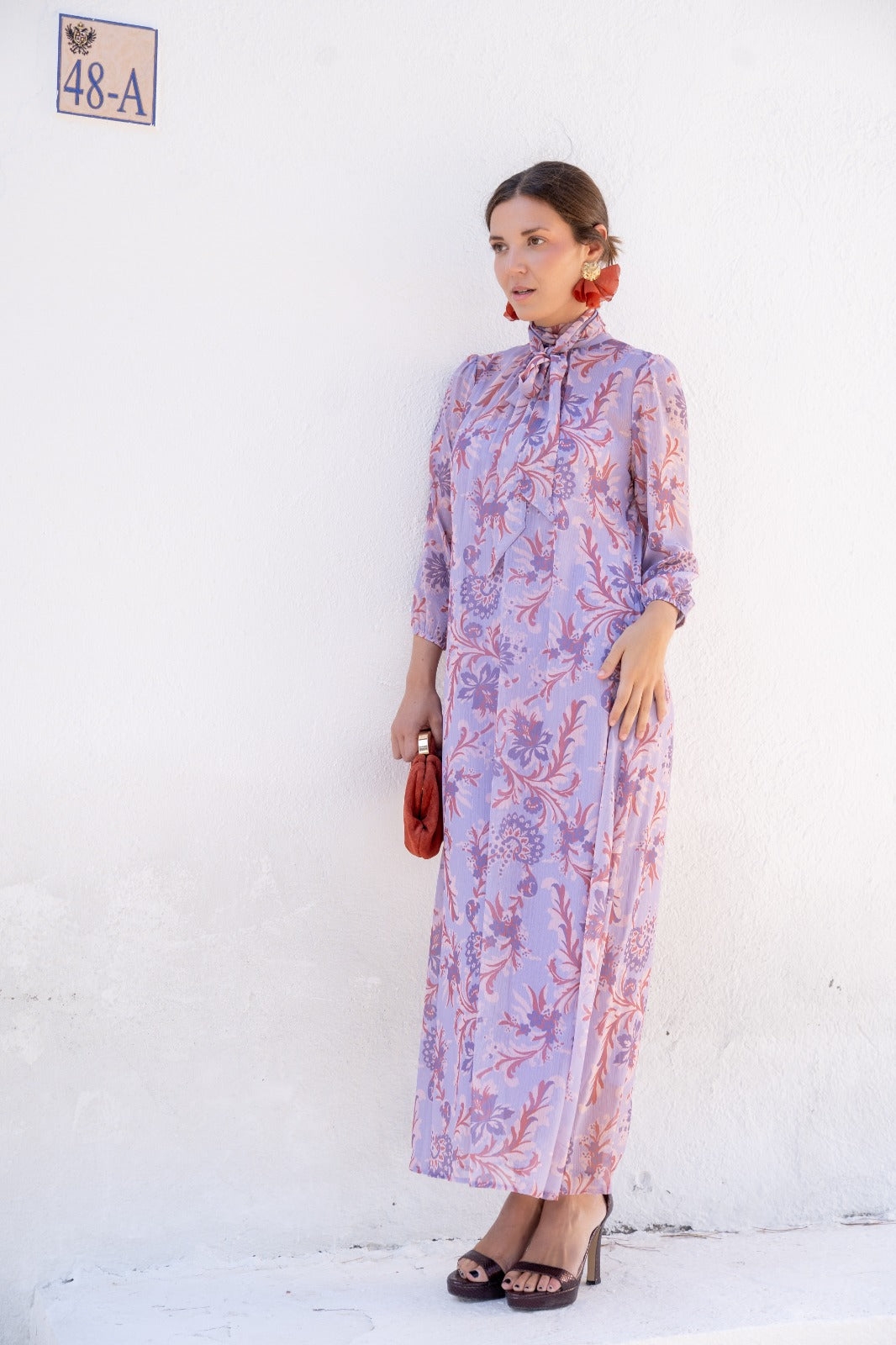 Long dress, slip dress underneath and tunic over it with a high neck and gathers, three-quarter puff sleeves, and a tie for the neck or waist. In lavender with a floral print.