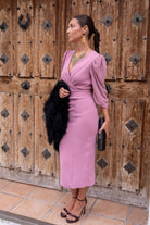 Midi dress, crossover neckline, three-quarter sleeves, pleated waist with belt, side slit. In pink.