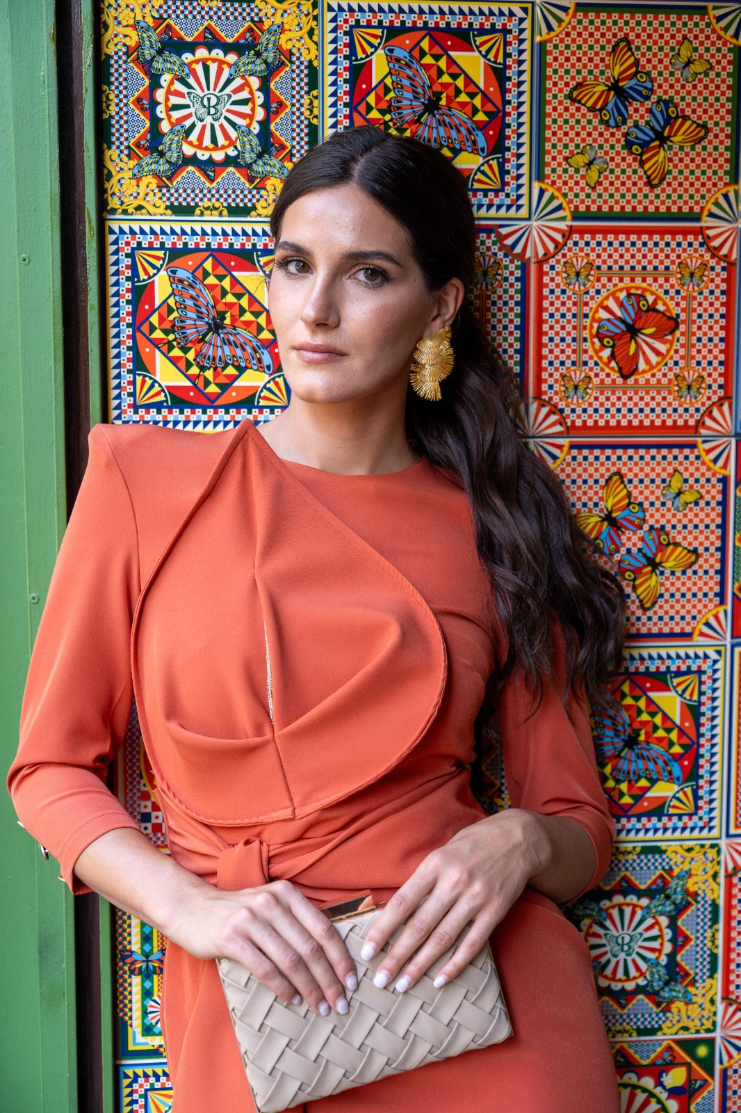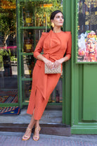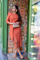 Midi dress with a round neckline, long sleeves with button details, a leaf at the chest, a belt, and a side slit. In a rust color.