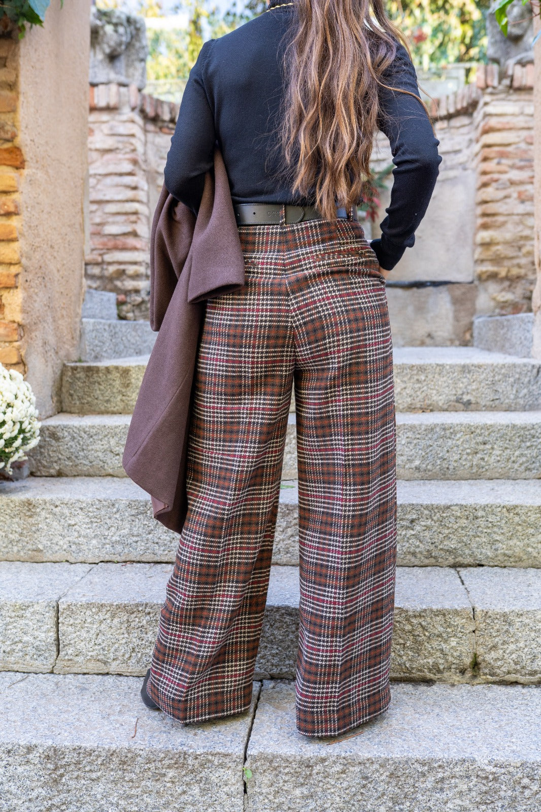 Trousers in fabric, side pockets, wide, in brown with multicolored checks.