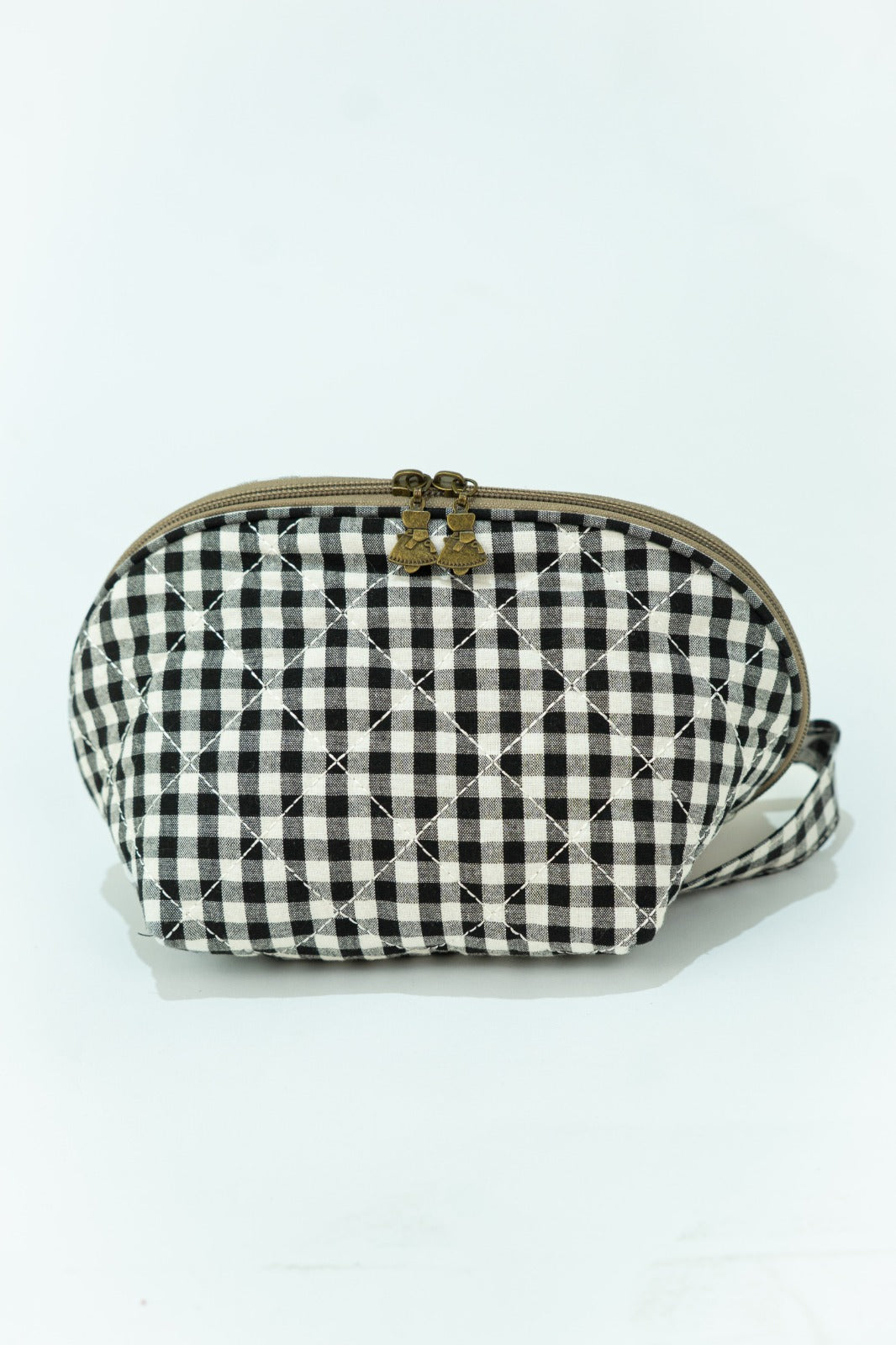Toiletry bag with zip closure, handle on one side, in black and white gingham.