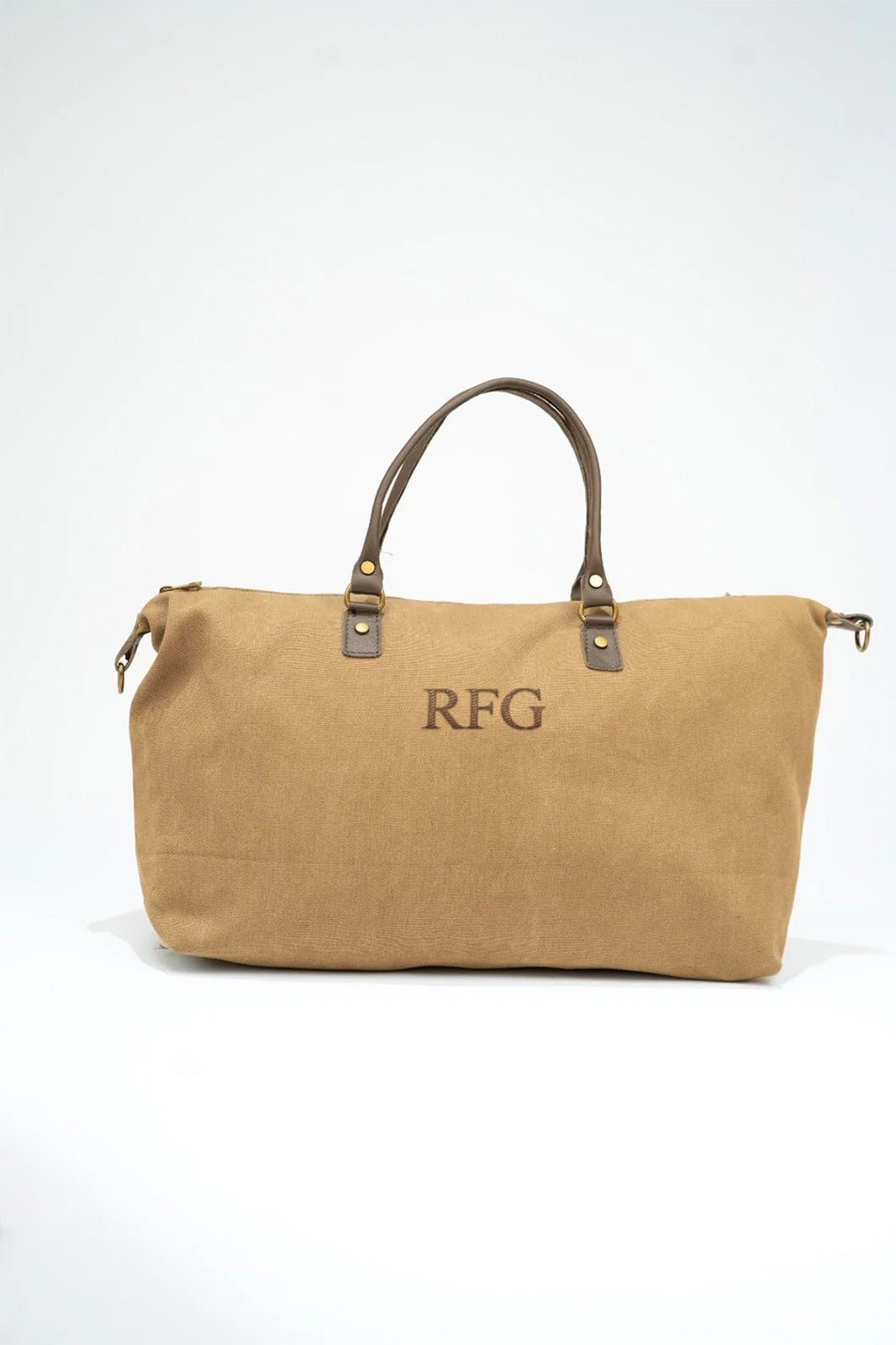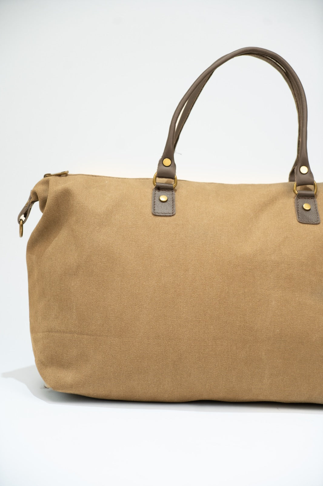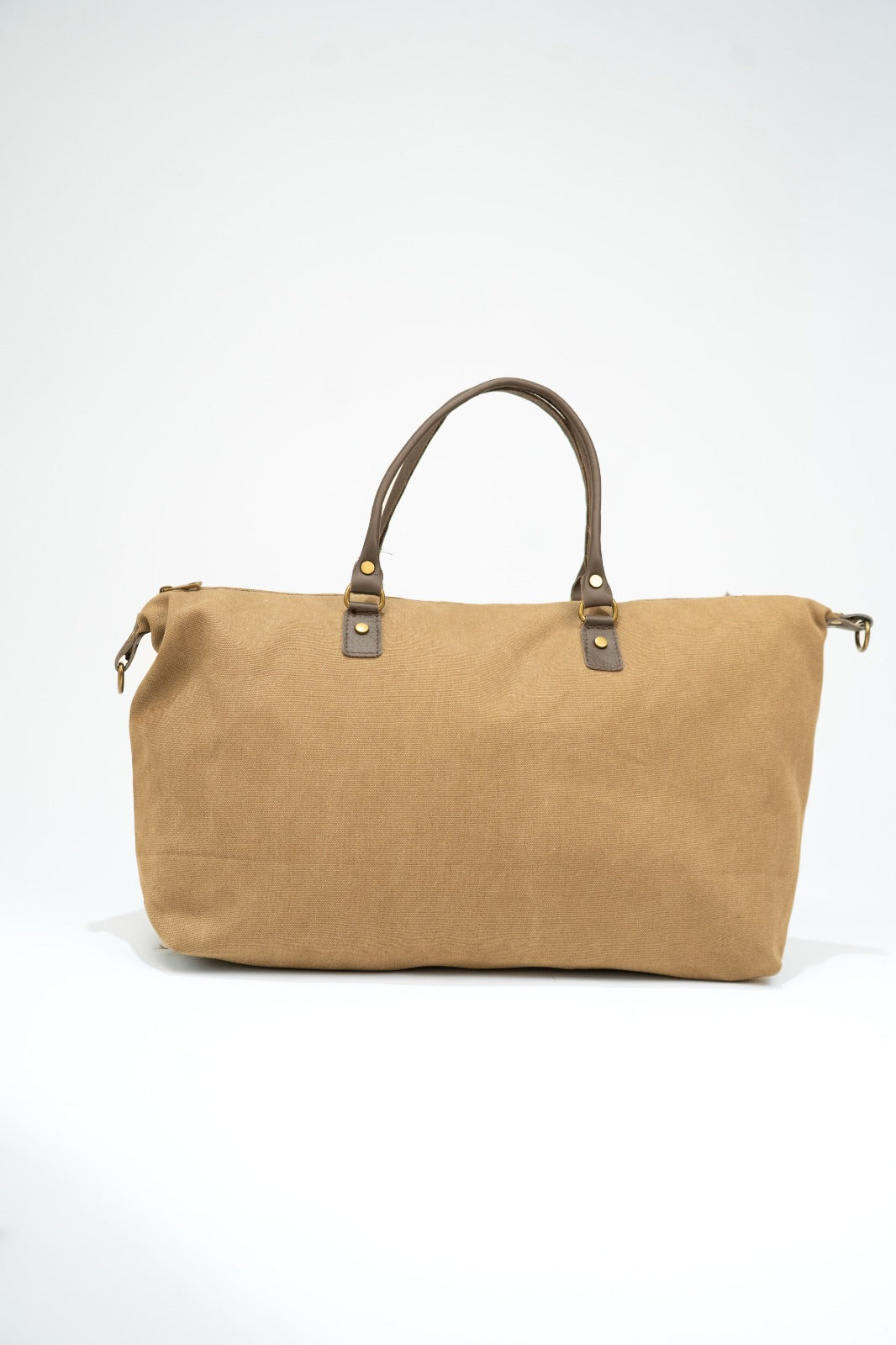 Canvas bag/suitcase with fixed leather handles and a removable, adjustable cotton strap in chocolate brown. Features a zip closure, black lining, and an interior pocket.