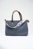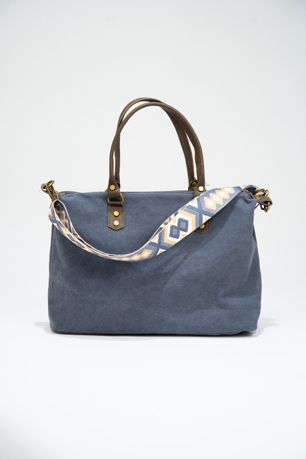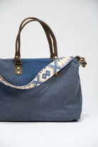 Canvas handbag with fixed leather handles and a removable, adjustable chocolate brown cotton strap. Features a zip closure, black lining, and an interior pocket. Available in blue.