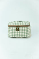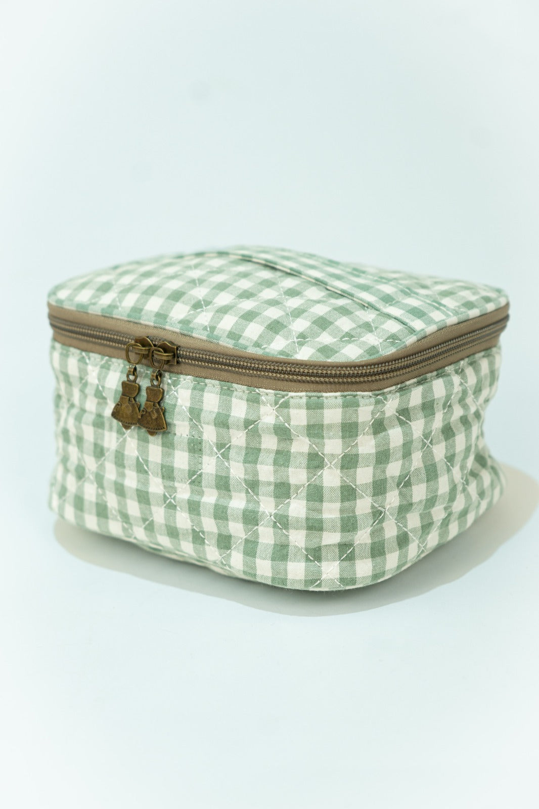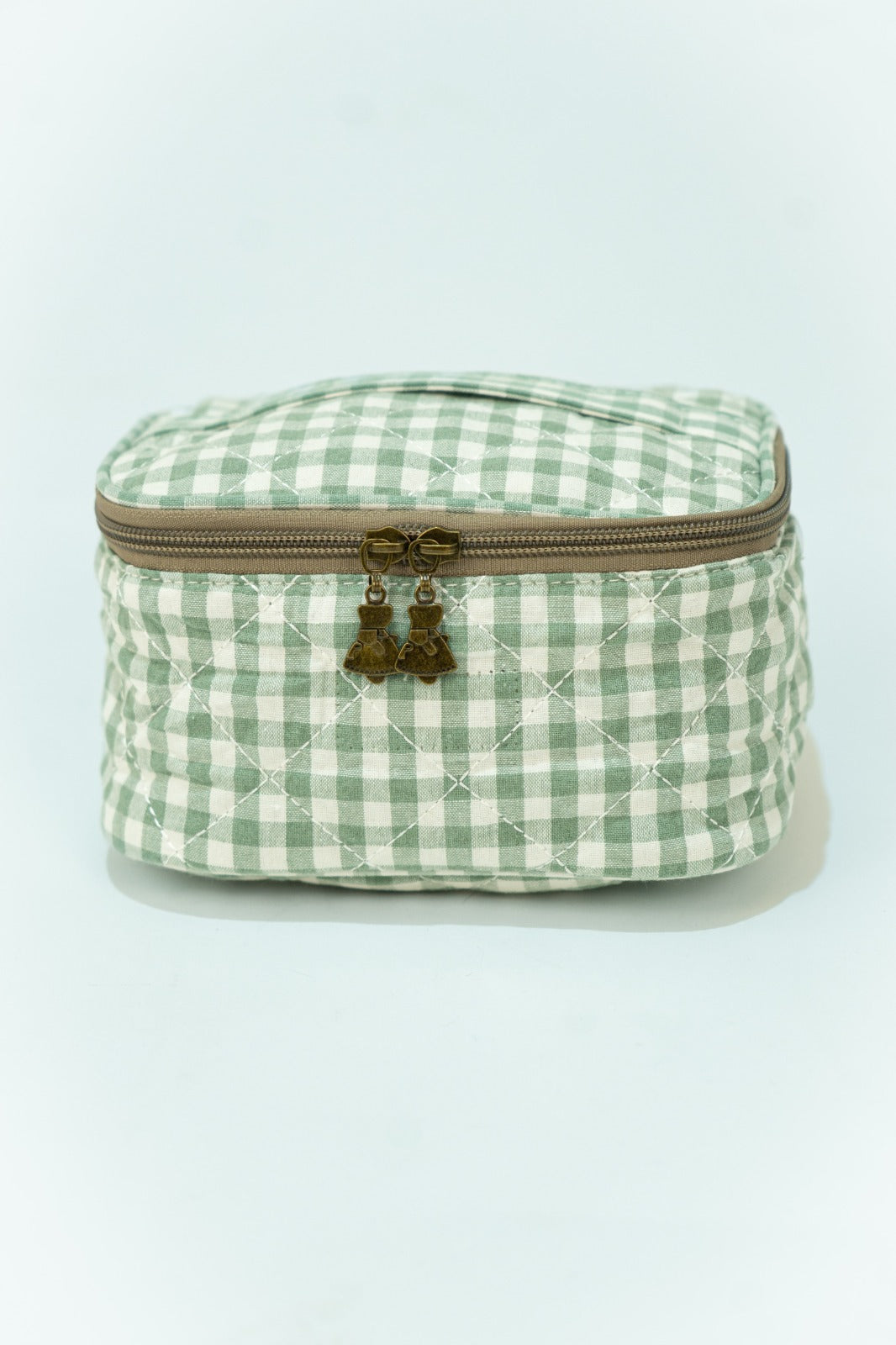 Toiletry bag with zip closure, handle at the top, interior pockets, in white and green gingham.