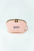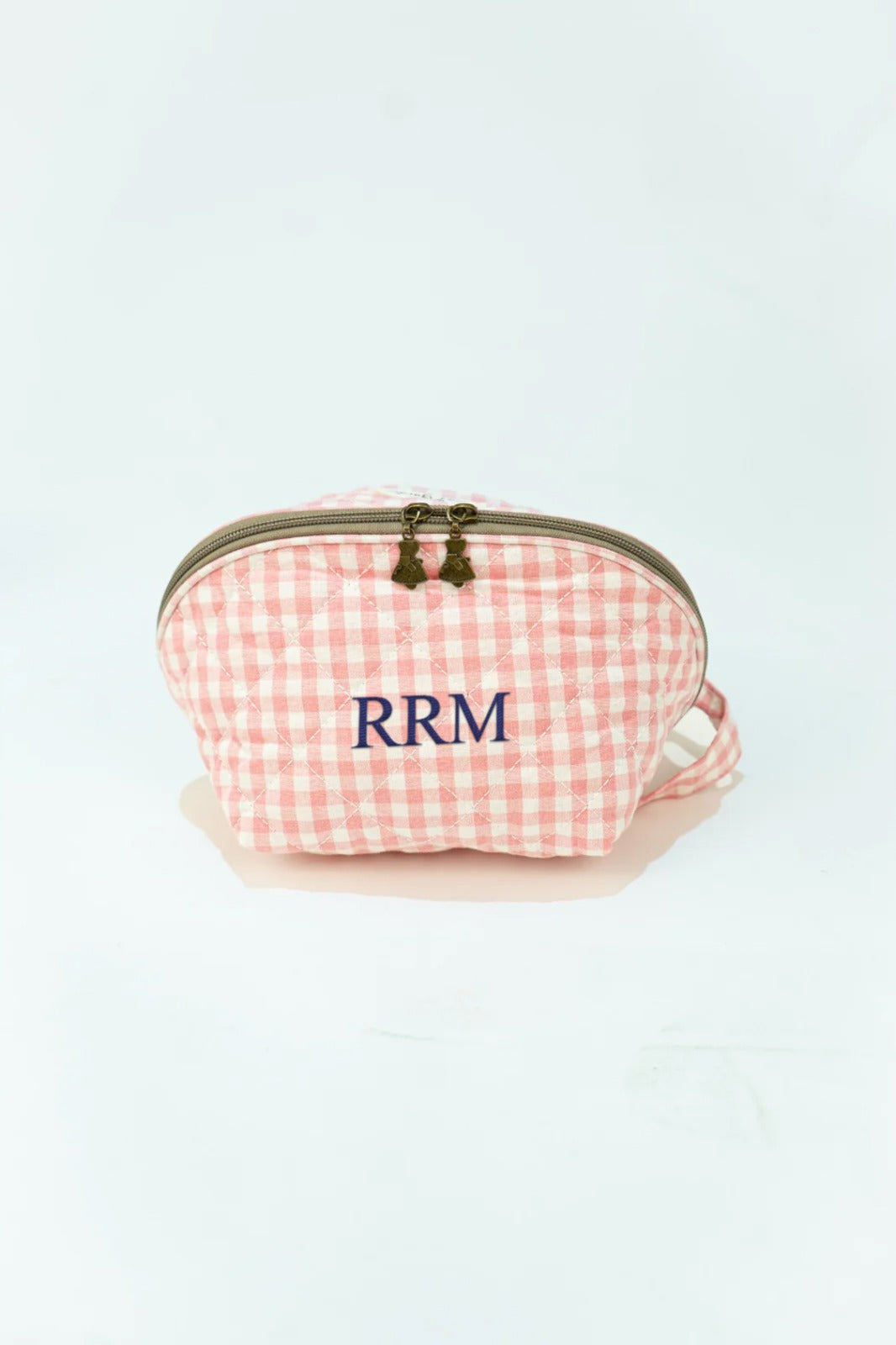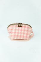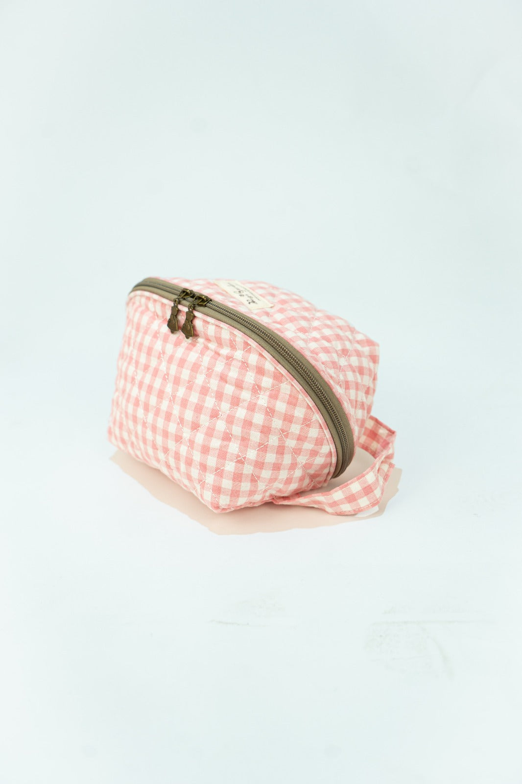 Toiletry bag with zip closure, handle on one side, in white and pink gingham.