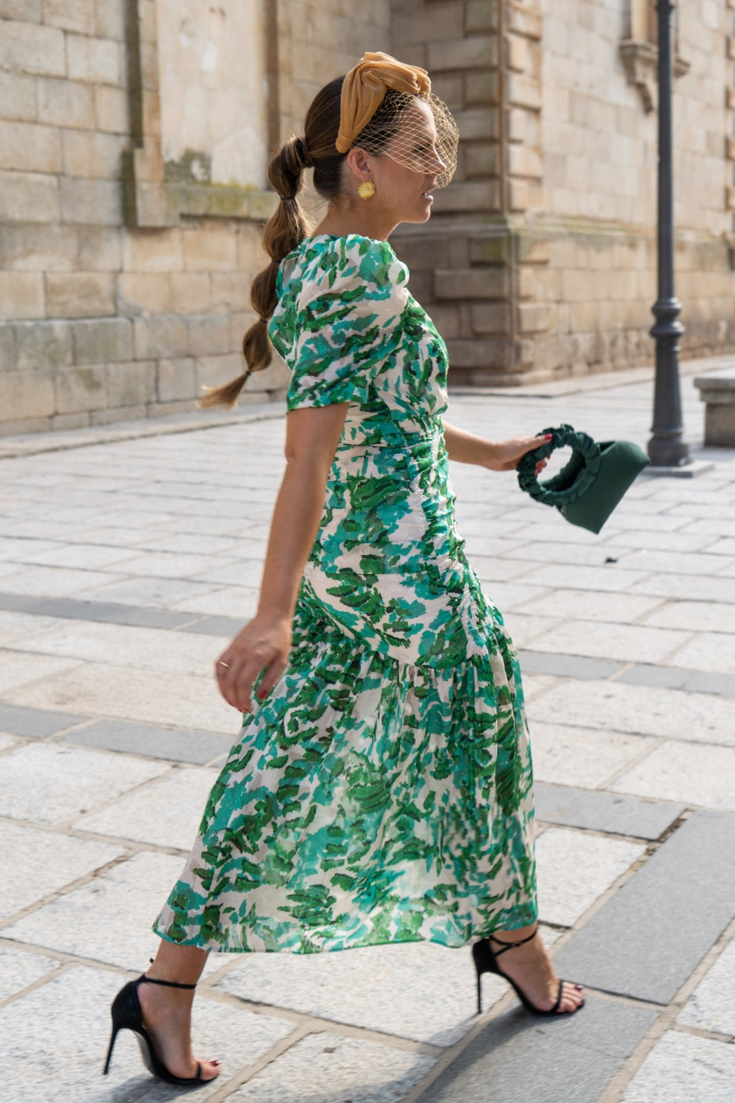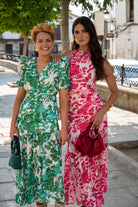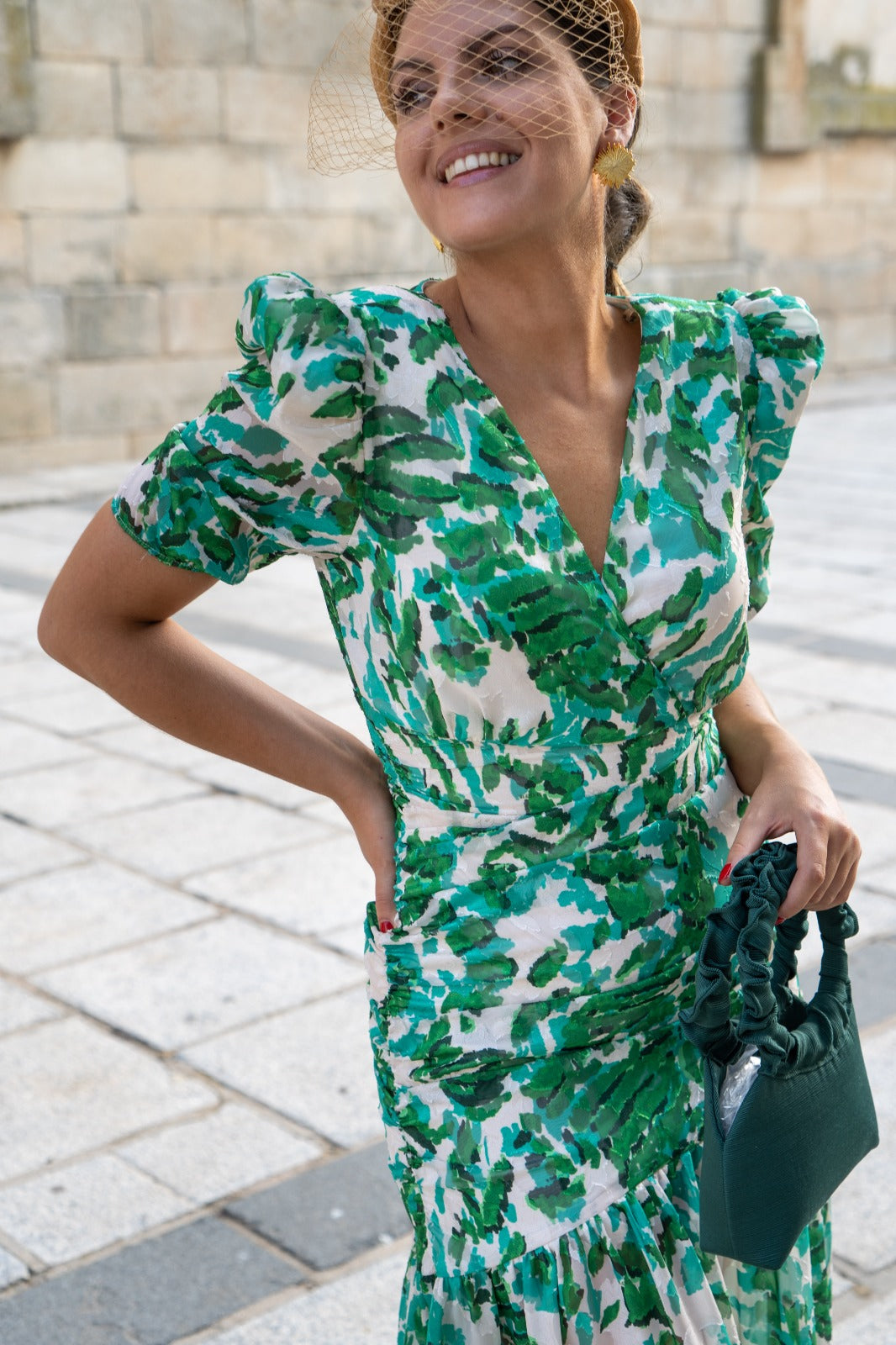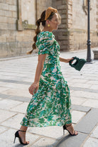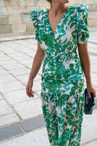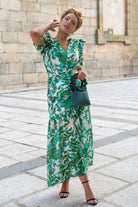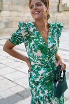 Midi dress with a V-neckline, short sleeves, gathered waist, and ruffle at the bottom. Green and white print.