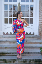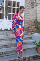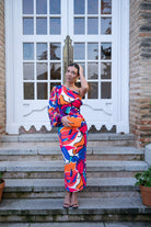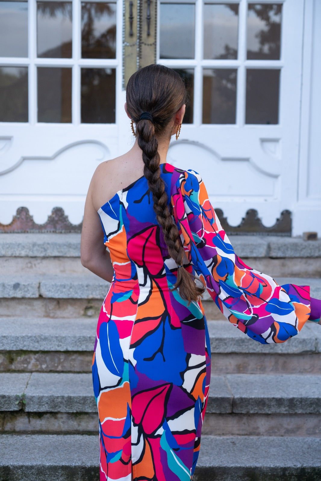 Asymmetrical dress on one side and long sleeves with cuffs on the other, gathered at the waist, and slit in the back. Multicolored print.