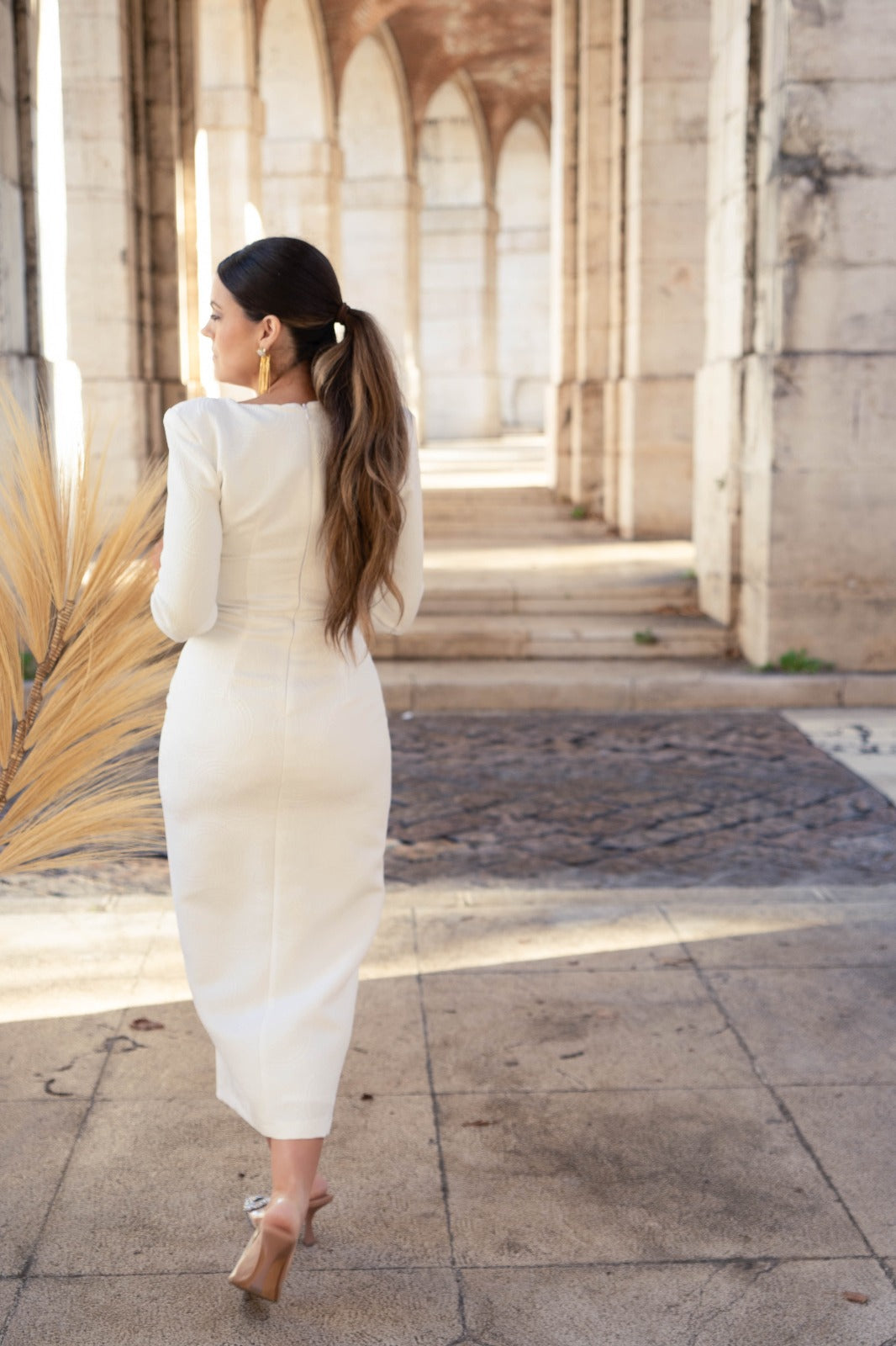 Midi dress with a V-neckline and small slit on one side, three-quarter sleeves, and a side slit in the front. White with a silver lurex pattern and detailing.