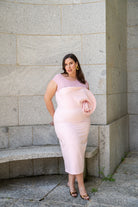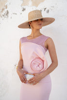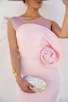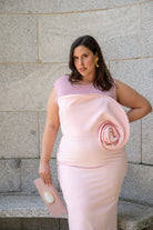 Midi dress with a round neckline, sleeveless, chiffon top, floral detail on the side, and back slit. In pink.