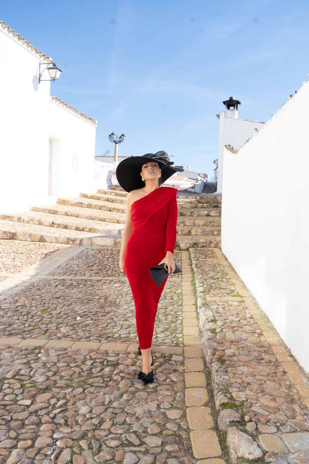 Asymmetrical midi dress with a draped cowl neckline that exposes one shoulder and wraps around the right arm, cut at the waist with a straight skirt. In burgundy knit.