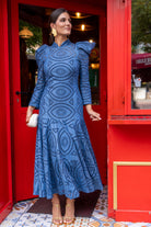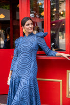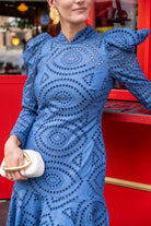 Maxi midi dress with a high neck, long sleeves, and a ruffle at the bottom. In blue, openwork fabric.