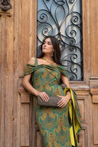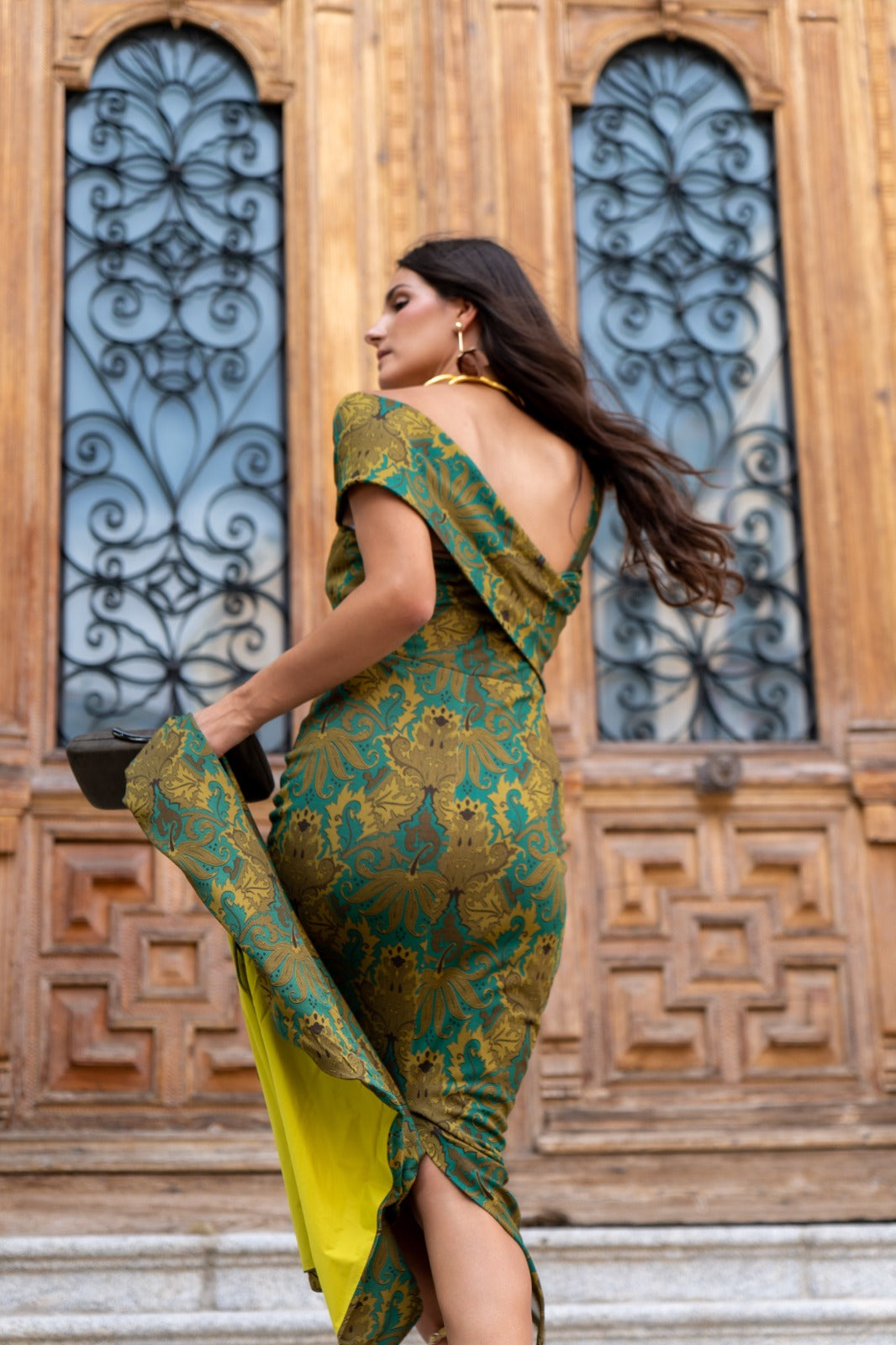 Midi dress, open neckline, straight, with detachable cape, back slit, in green jacquard print.