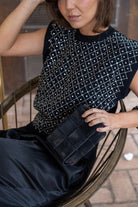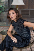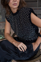 Round neck vest, in black with glitter and silver sequin details on the front, black on the back.